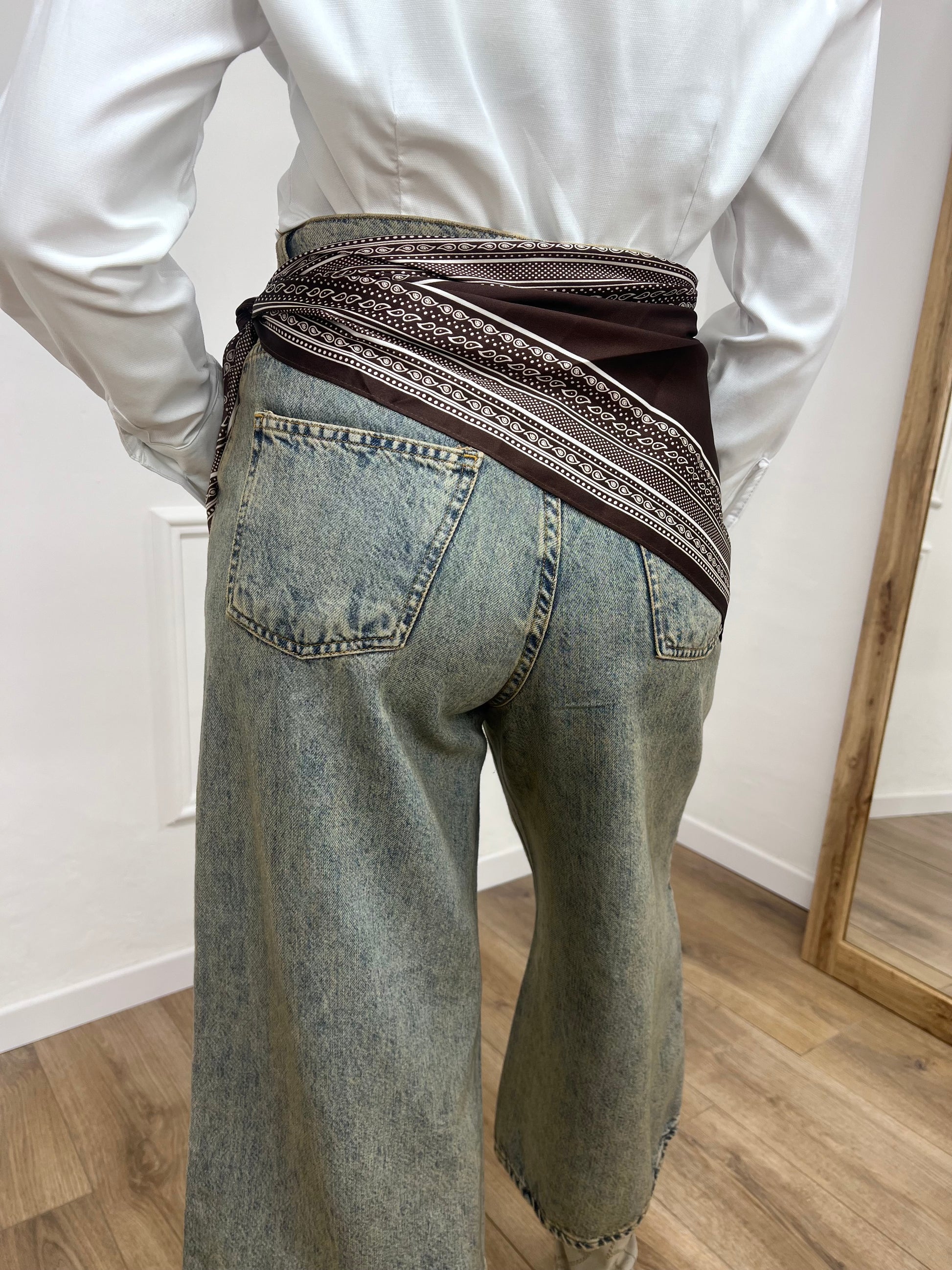 Foulard triangolo in satin, stampa bandana. Accessorio da portare su un pantalone per arricchire l’outfit.