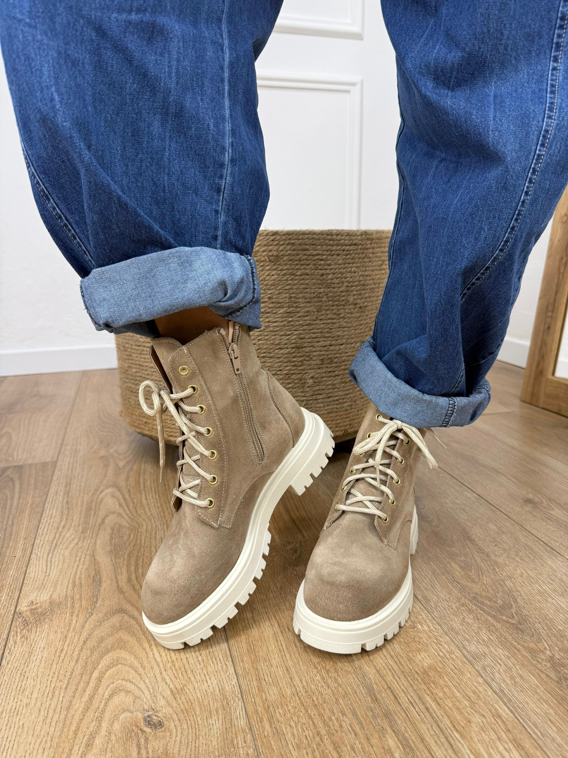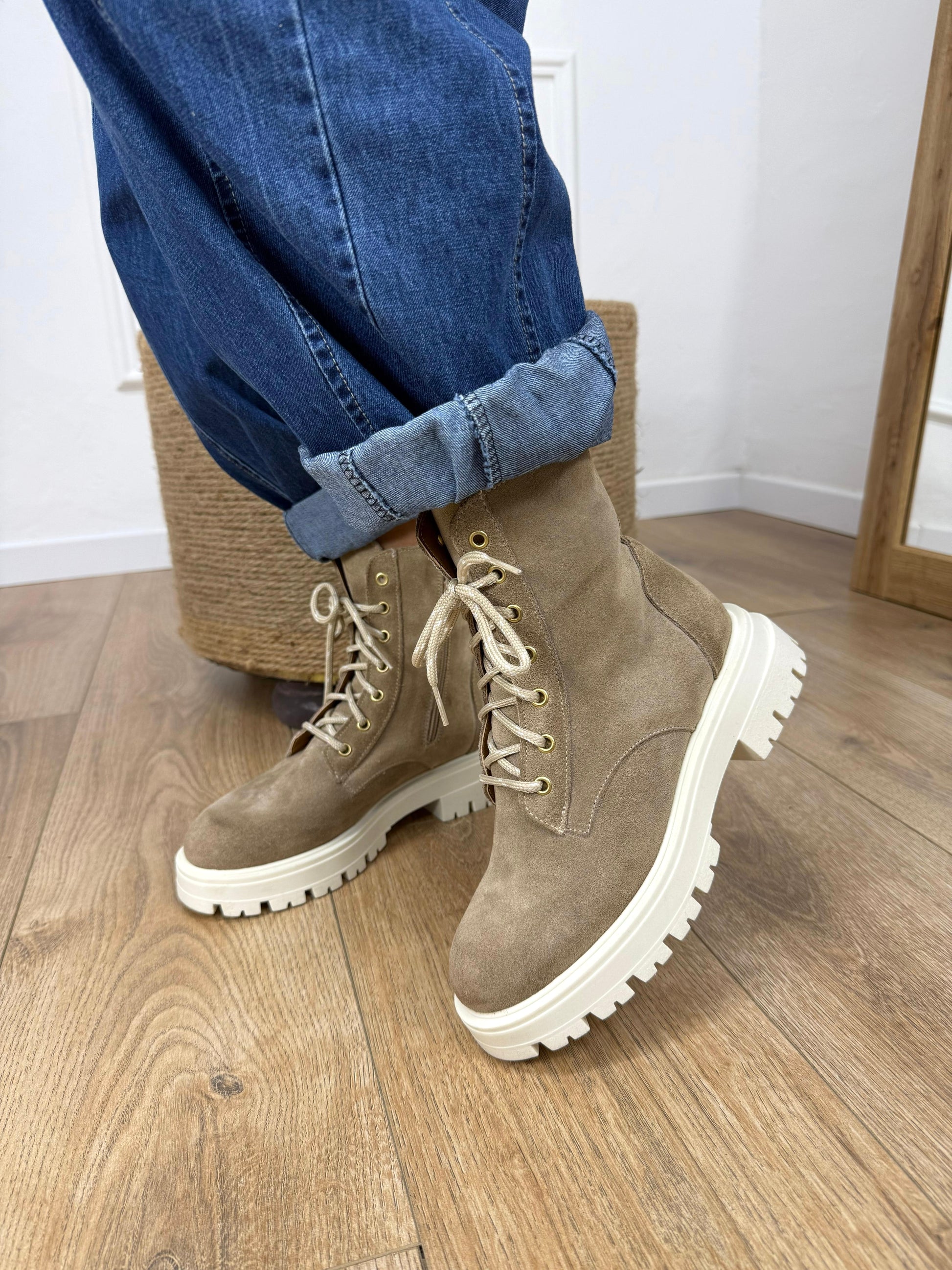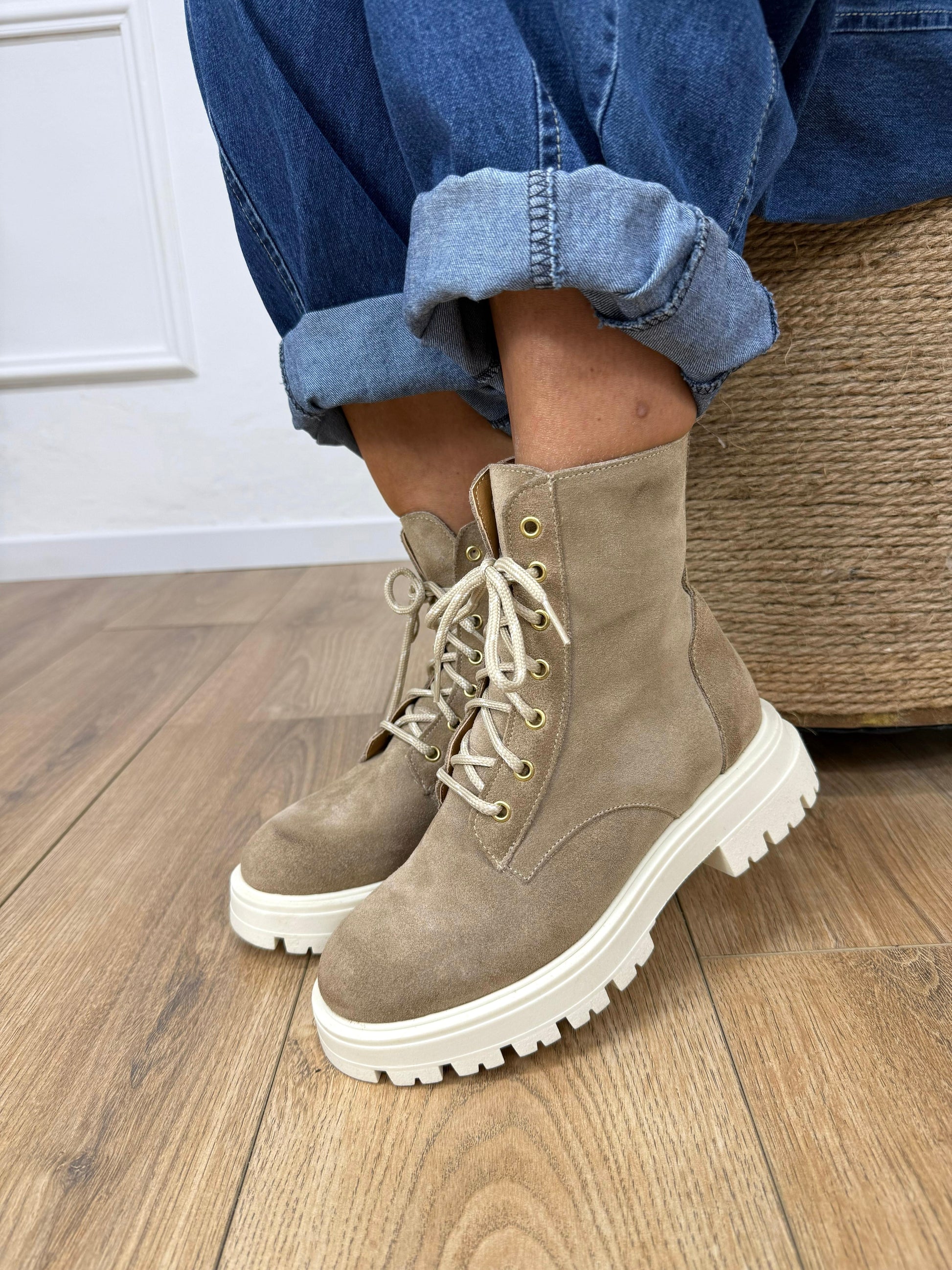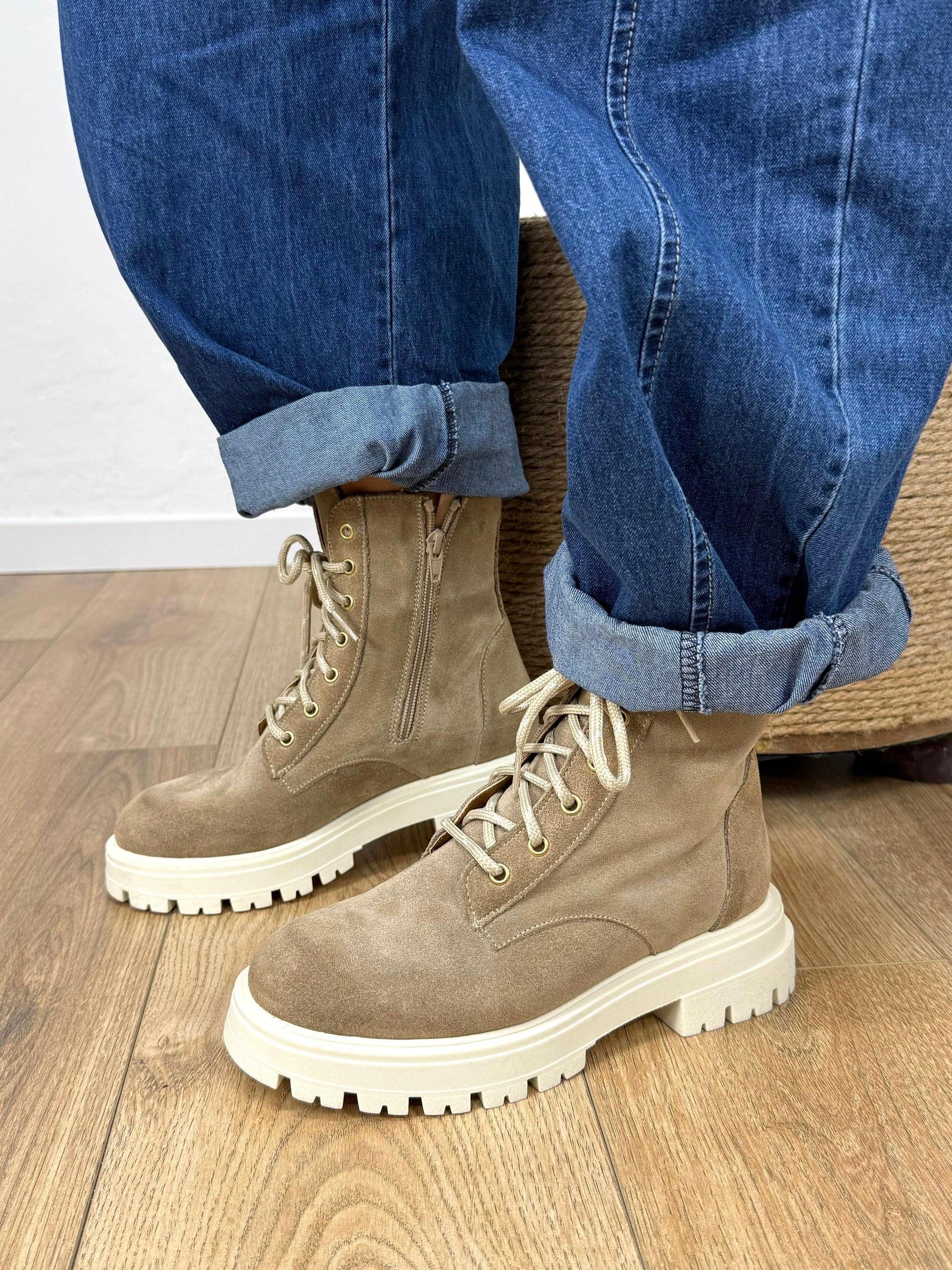 Stive anfibio in pelle scamosciata. Lacci in corda. Cerniera nella parte interna. Suola in gomma.