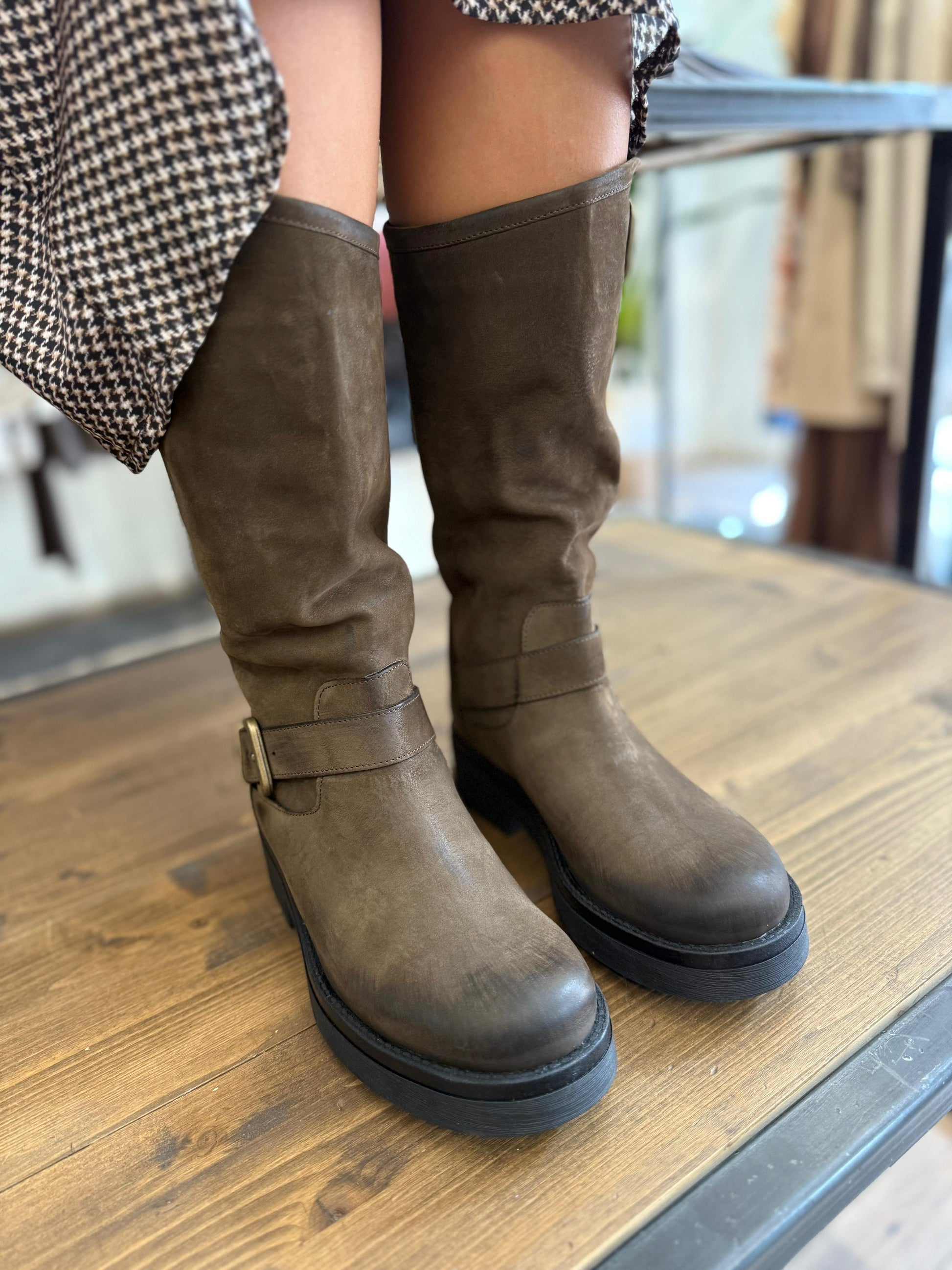 Stivale modello biker con fibbie. NABUK spazzolato. Suola in gomma antiscivolo.