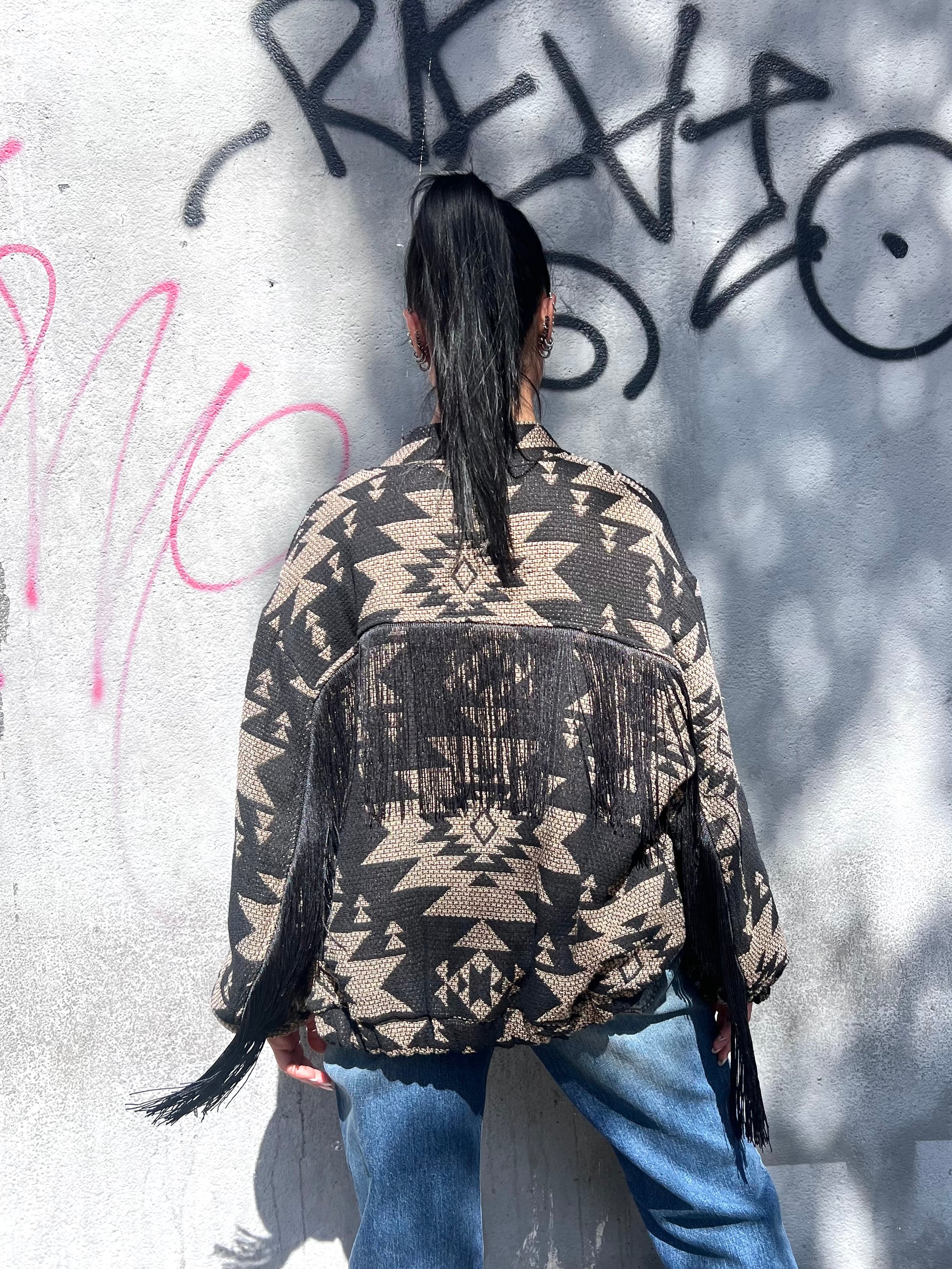 Bomber over over con frange maniche e schiena sottili. Tessuto jacquard. Nero/cammello.