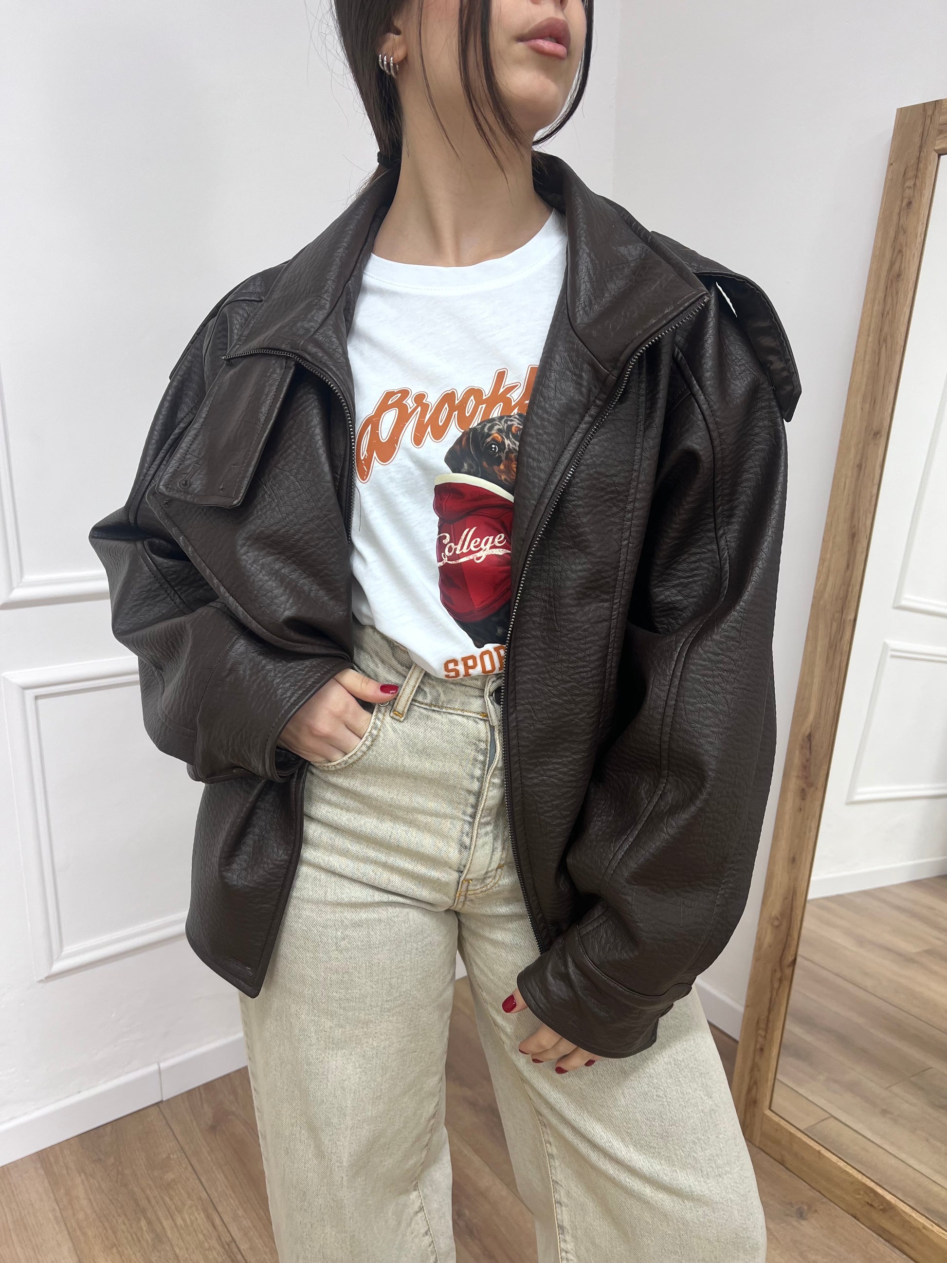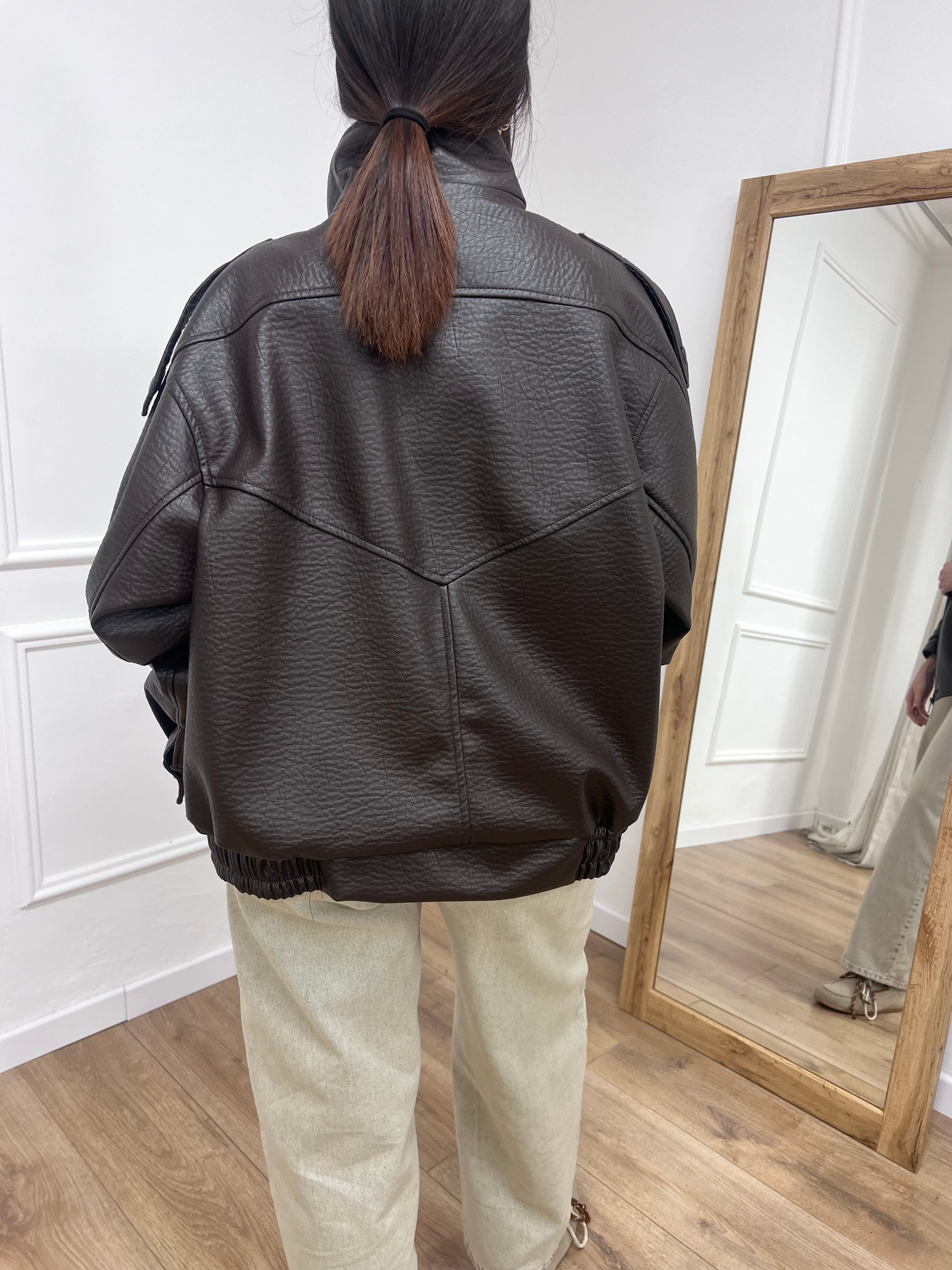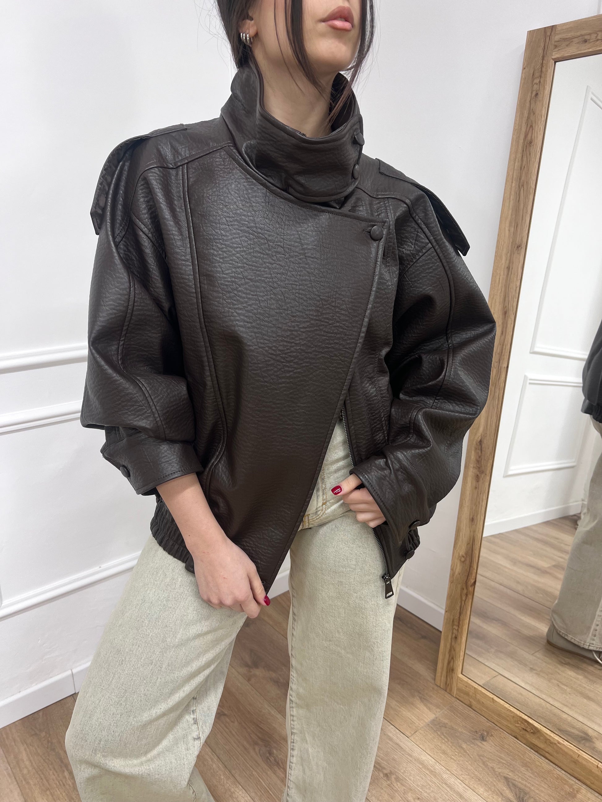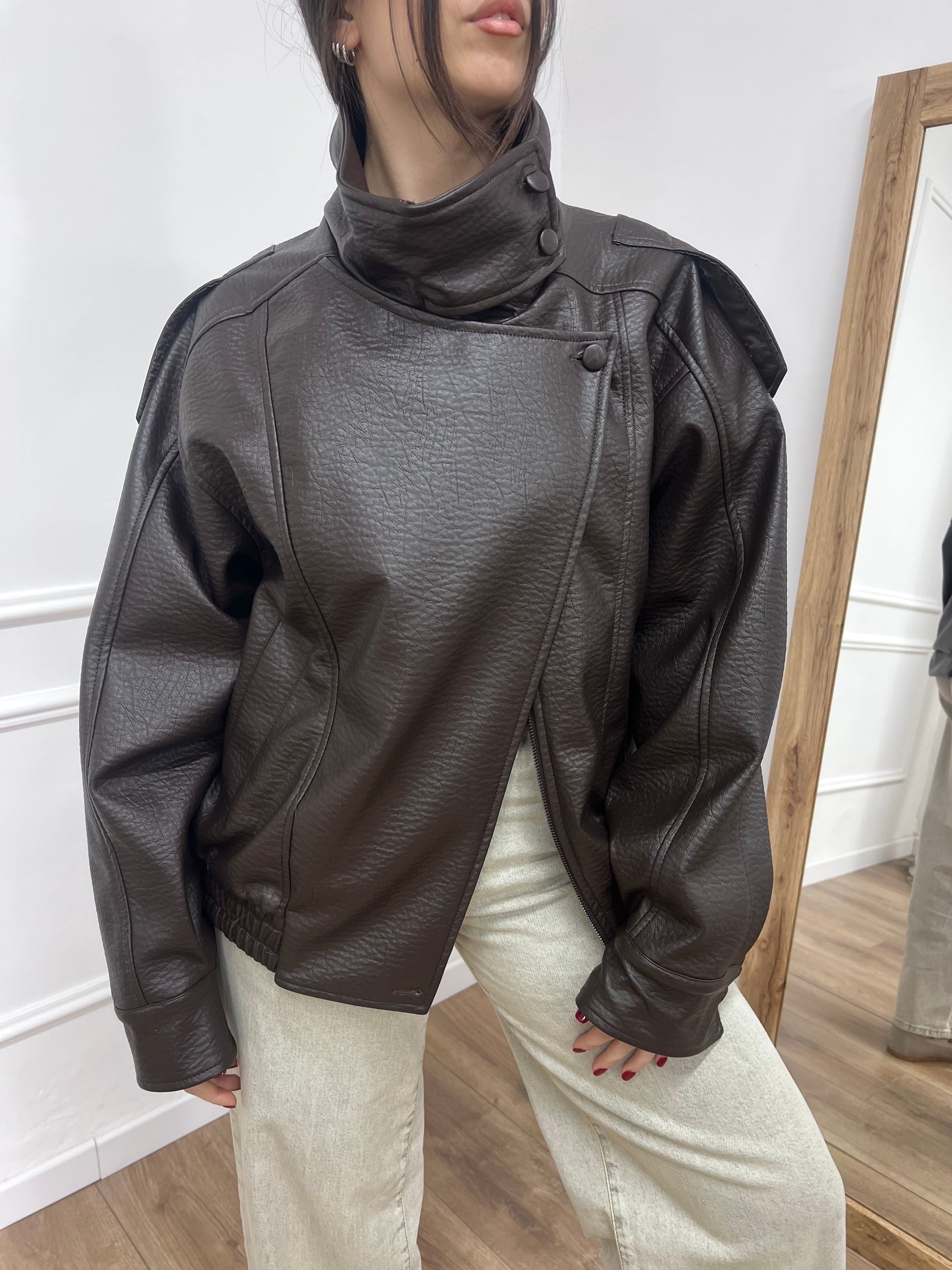 Bomber modello over con collo imbuto. Chousura con cerniera e patta. Ecopelle effetto martellato. Foderato.