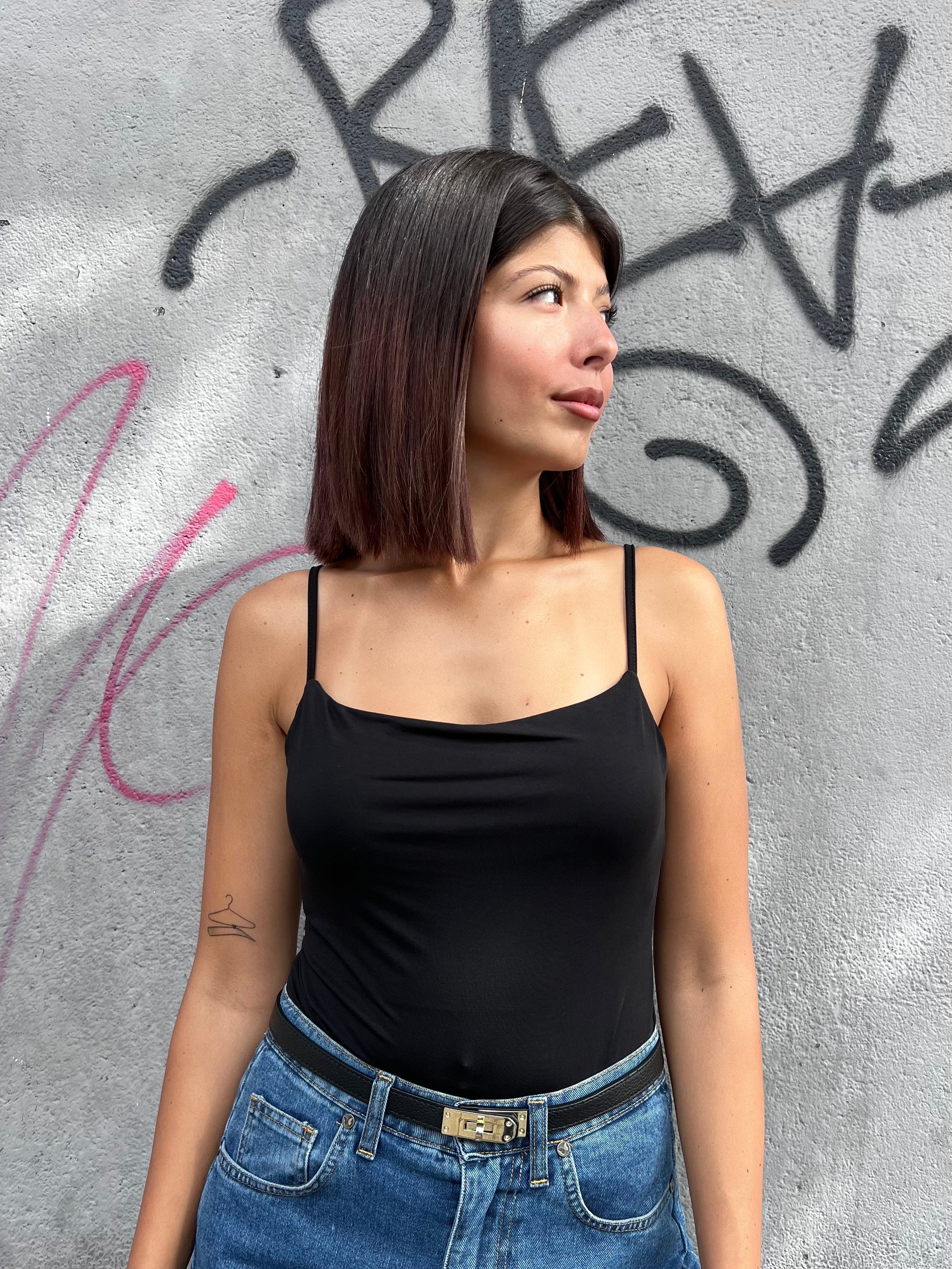Body in modal, scollo quadro con spalline fine regolabili. Tessuto morbido. Aderente, perfetto come sotto giacca.