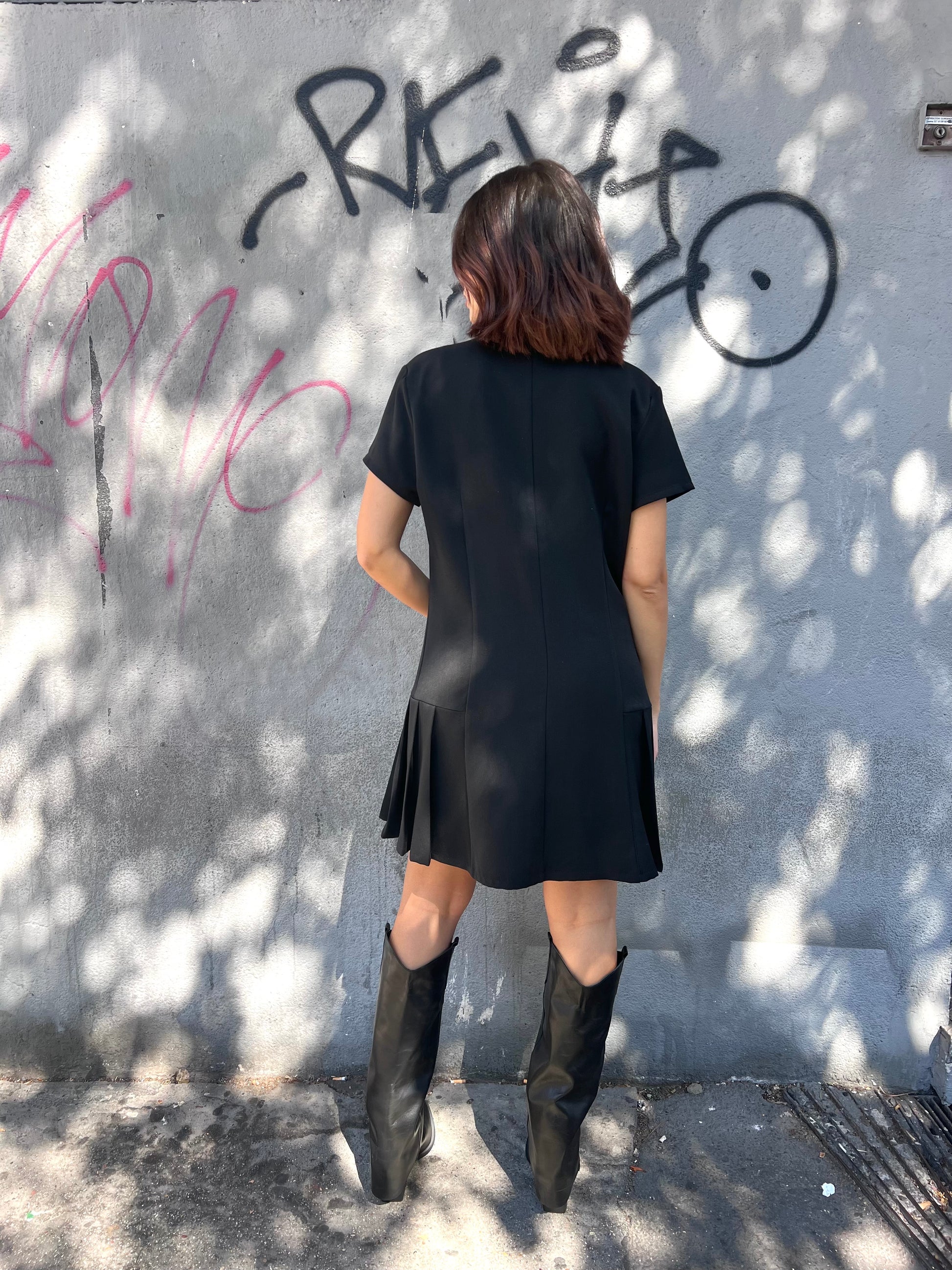 Abito corto modello chemisier, manica corta. Gonnellino svasato con lati pences. Cravatta con spilla apetta, possibilità di metterla anche come fusciacca.