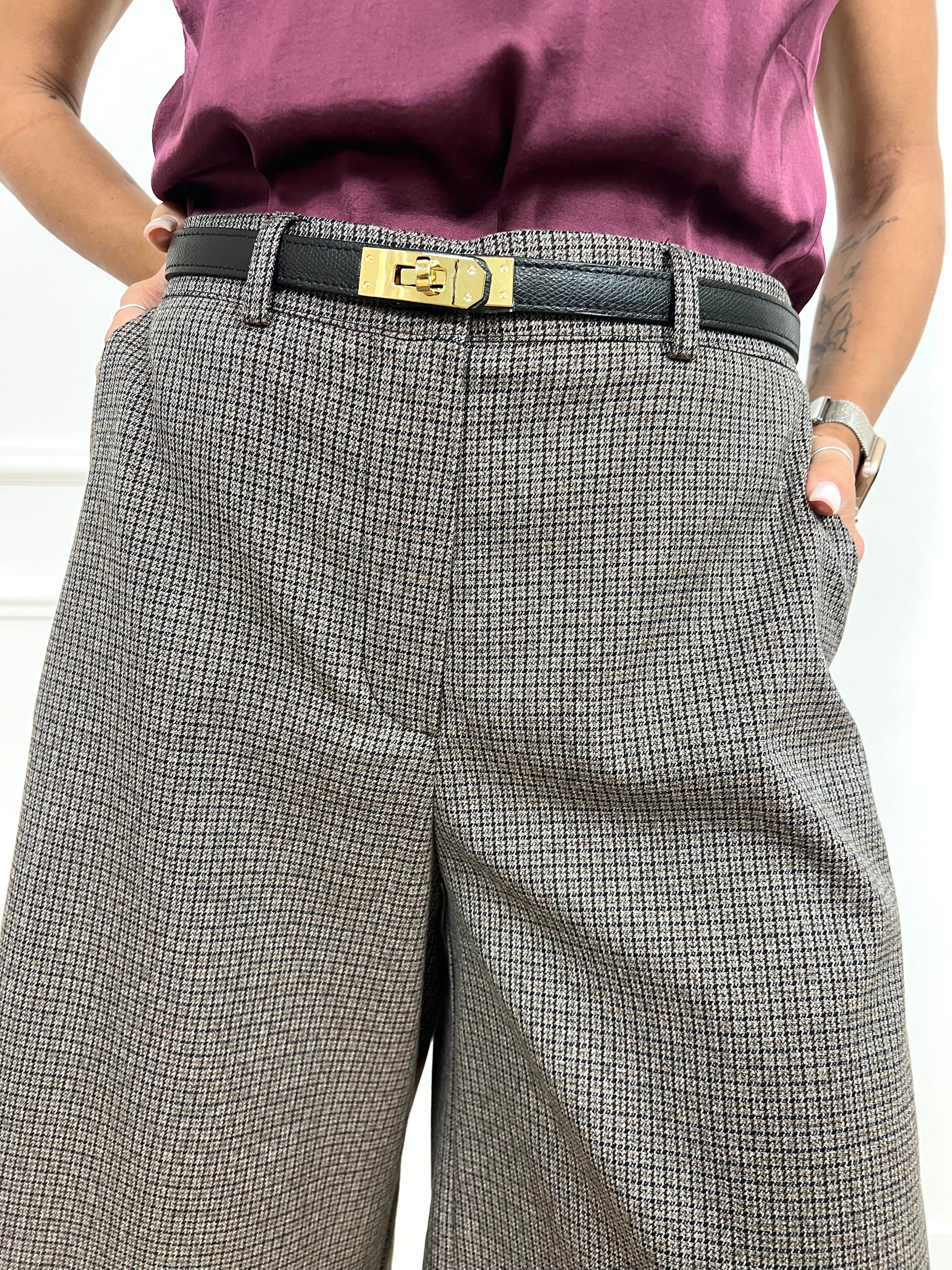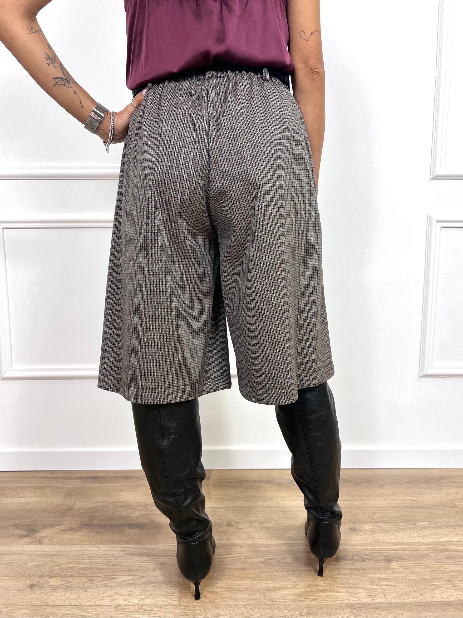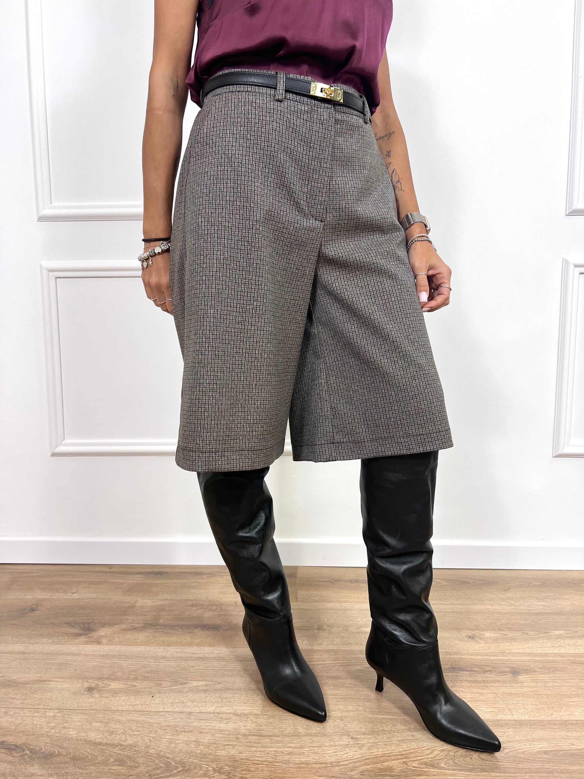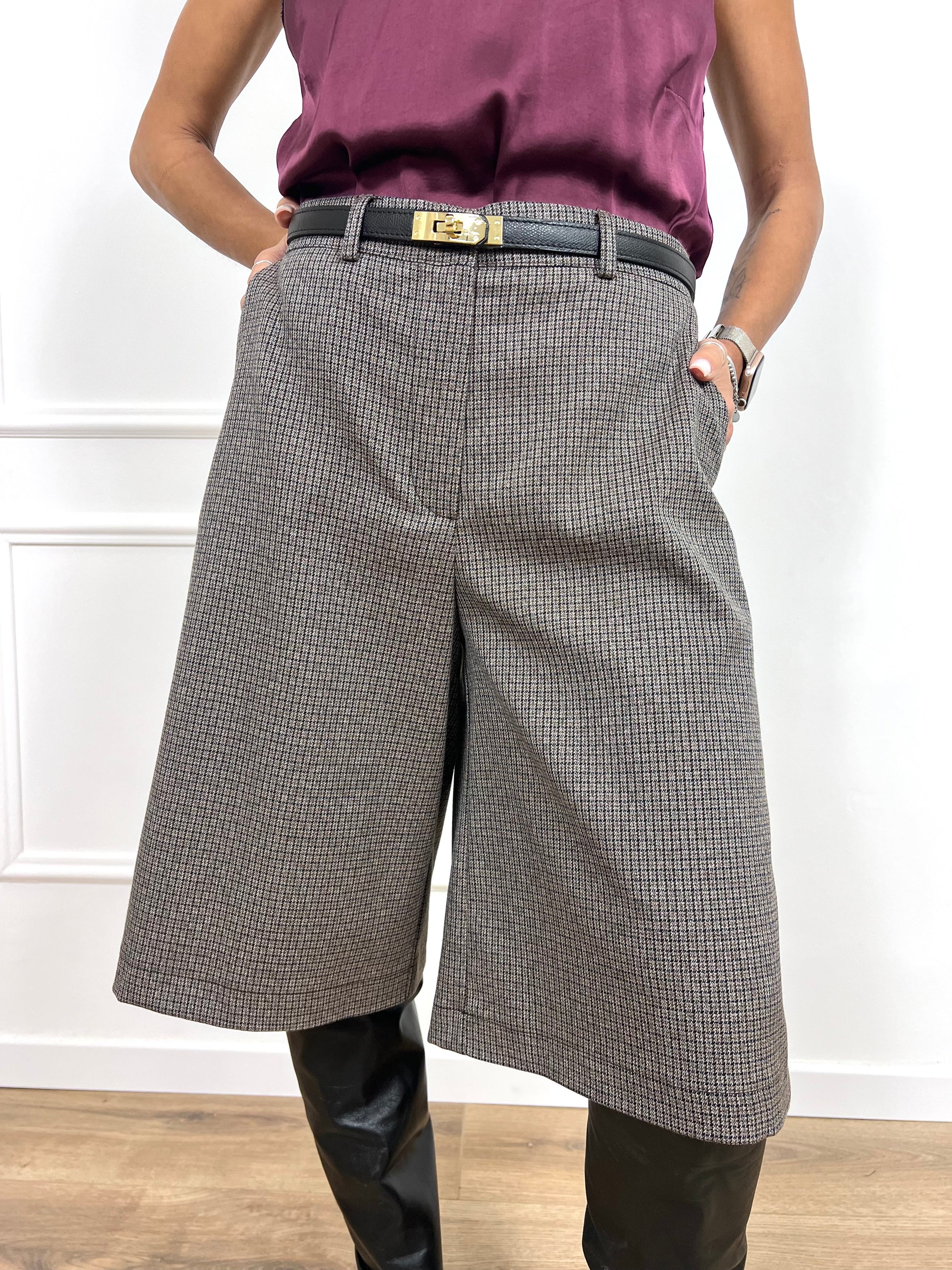 Bermuda vita regolare gamba ampia. Chiusura cerniera e bottone. Passanti. Fantasia quadretto, moro, tortora blu.
