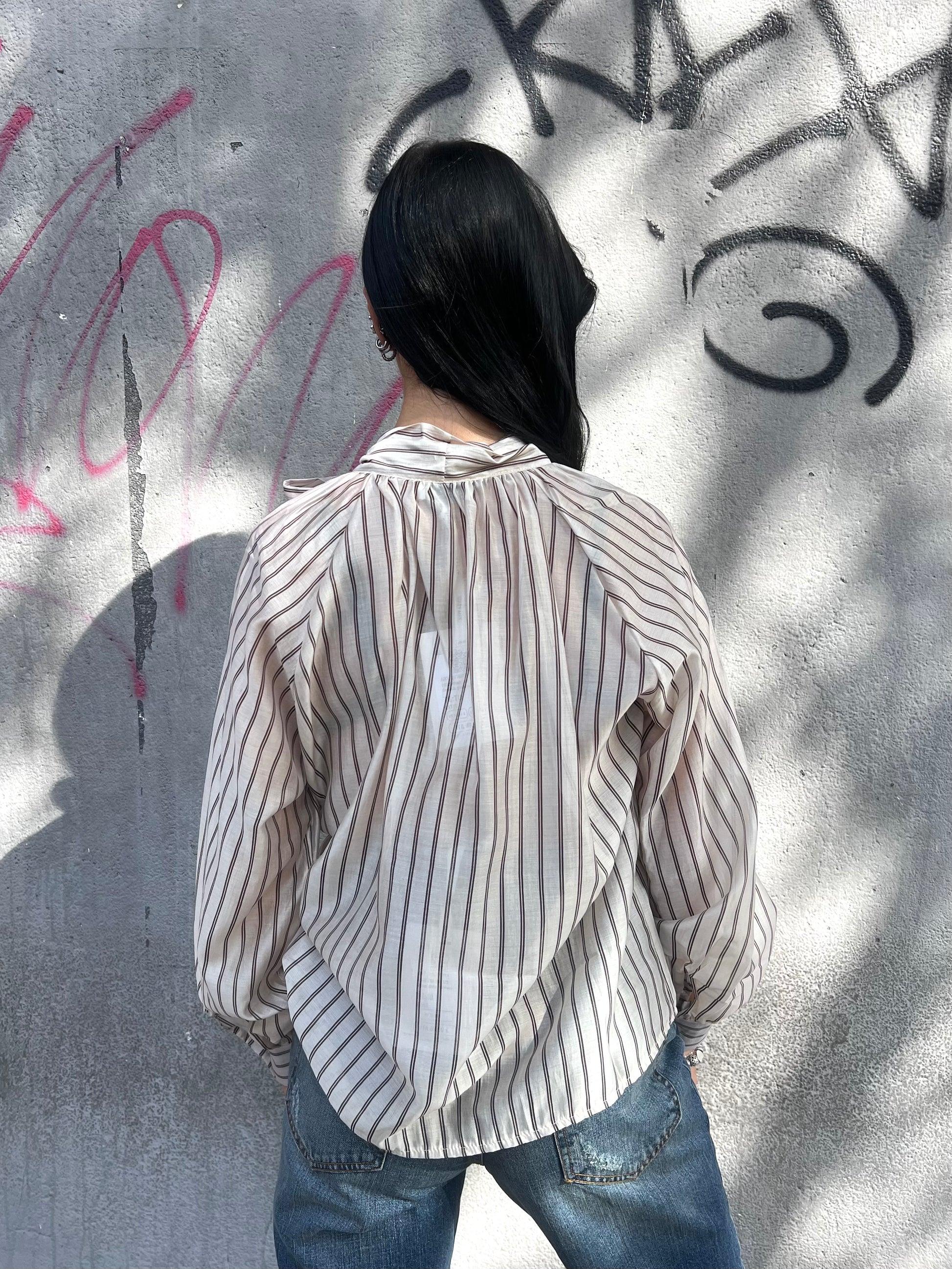 Blusa collo coreano con fiocco. Taglia morbido. Tessuto leggero in lyocell, gessata.