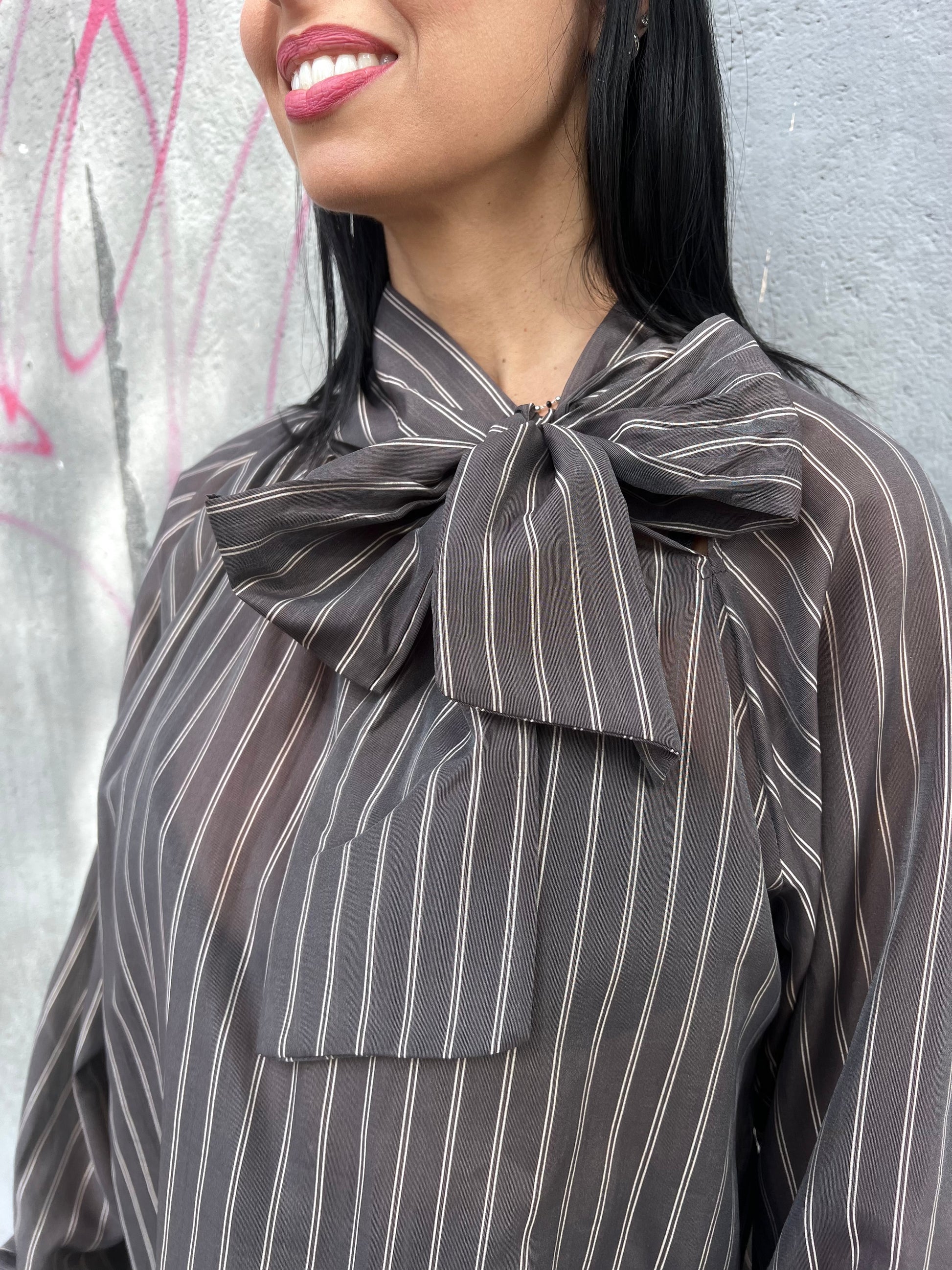 Blusa collo coreano con fiocco. Taglia morbido. Tessuto leggero in lyocell, gessata.