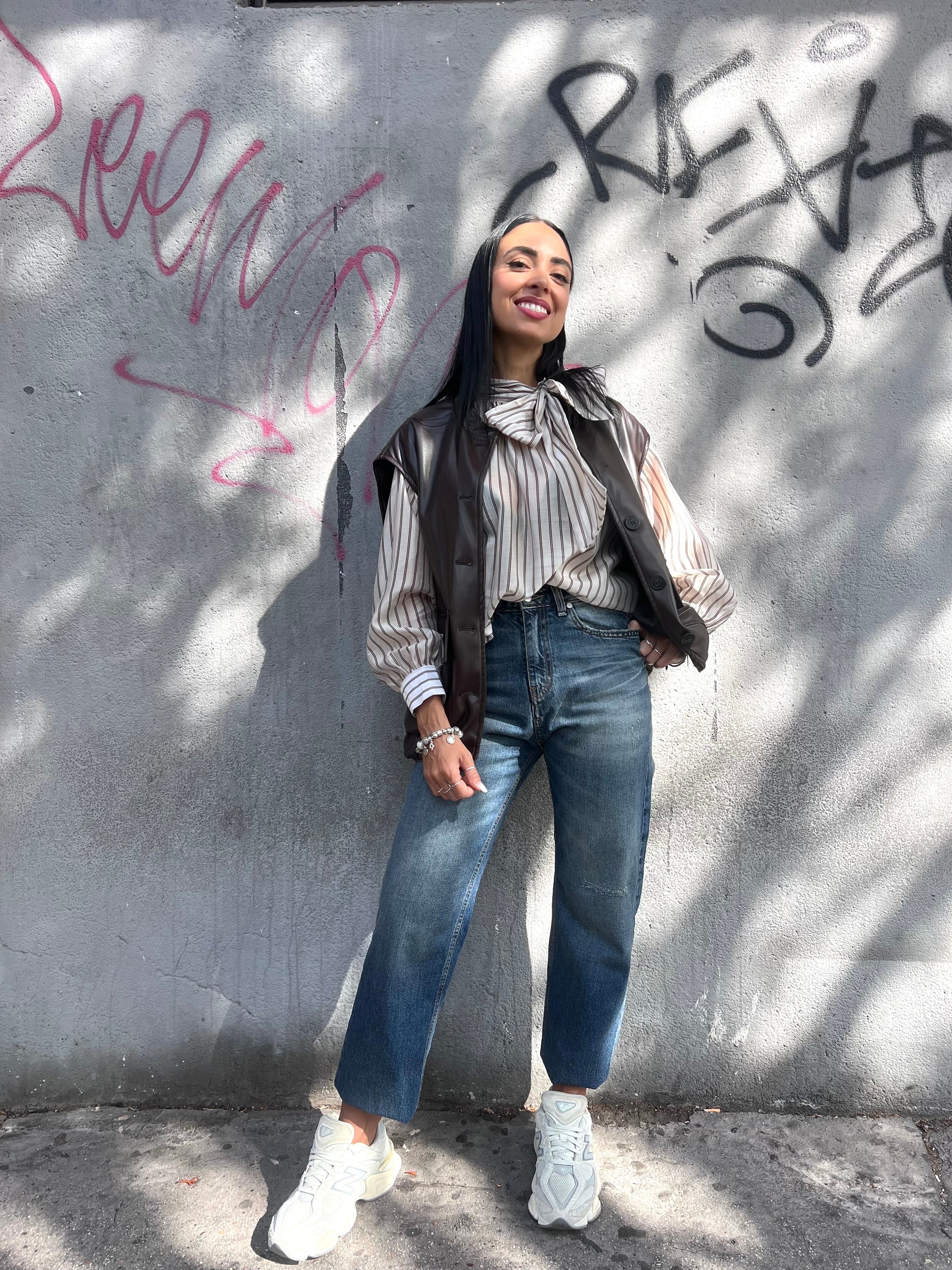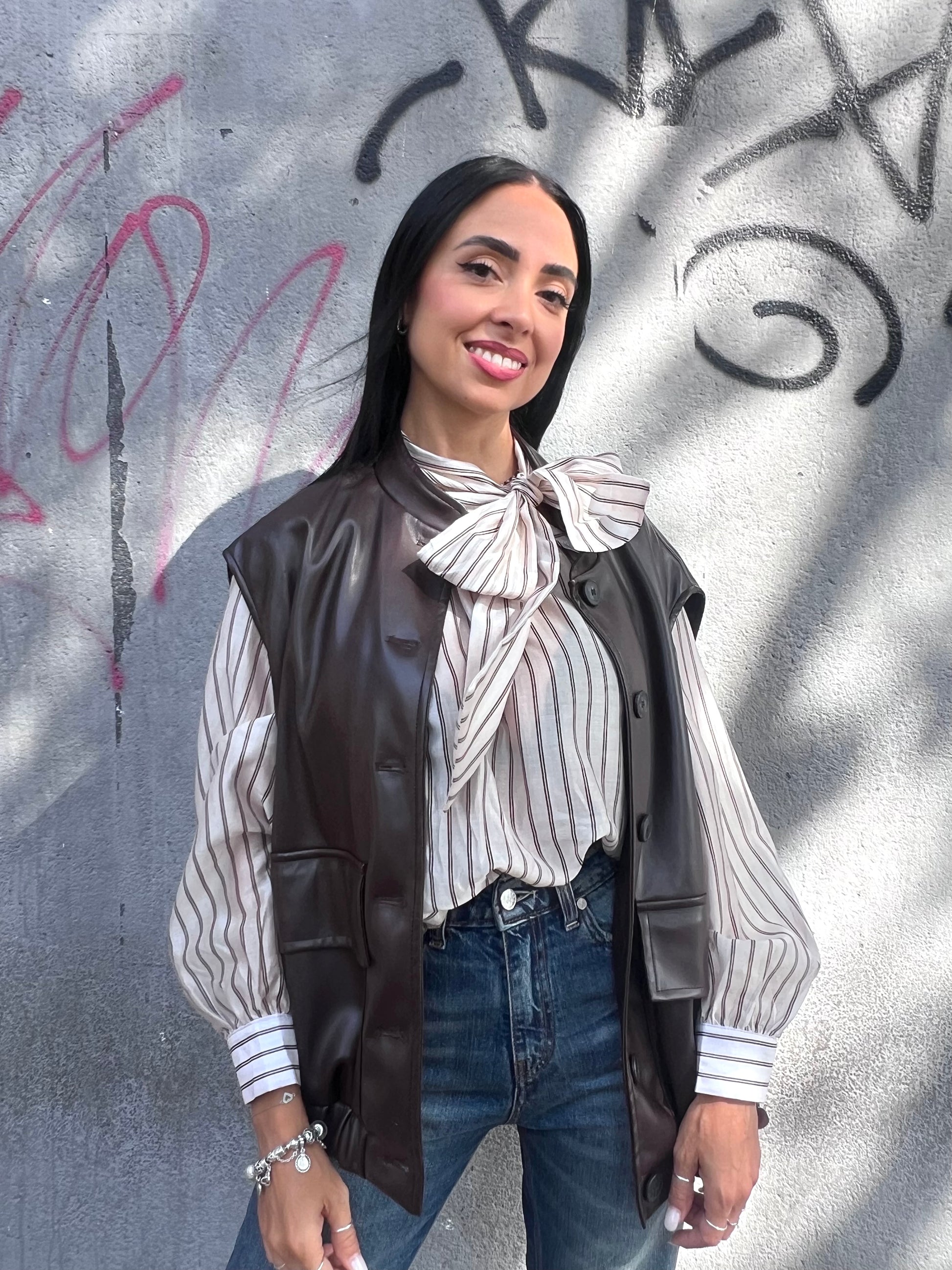 Bomber gilet ecopelle, modello over con chiusura bottoni. Tasche avanti. Elastico finale.