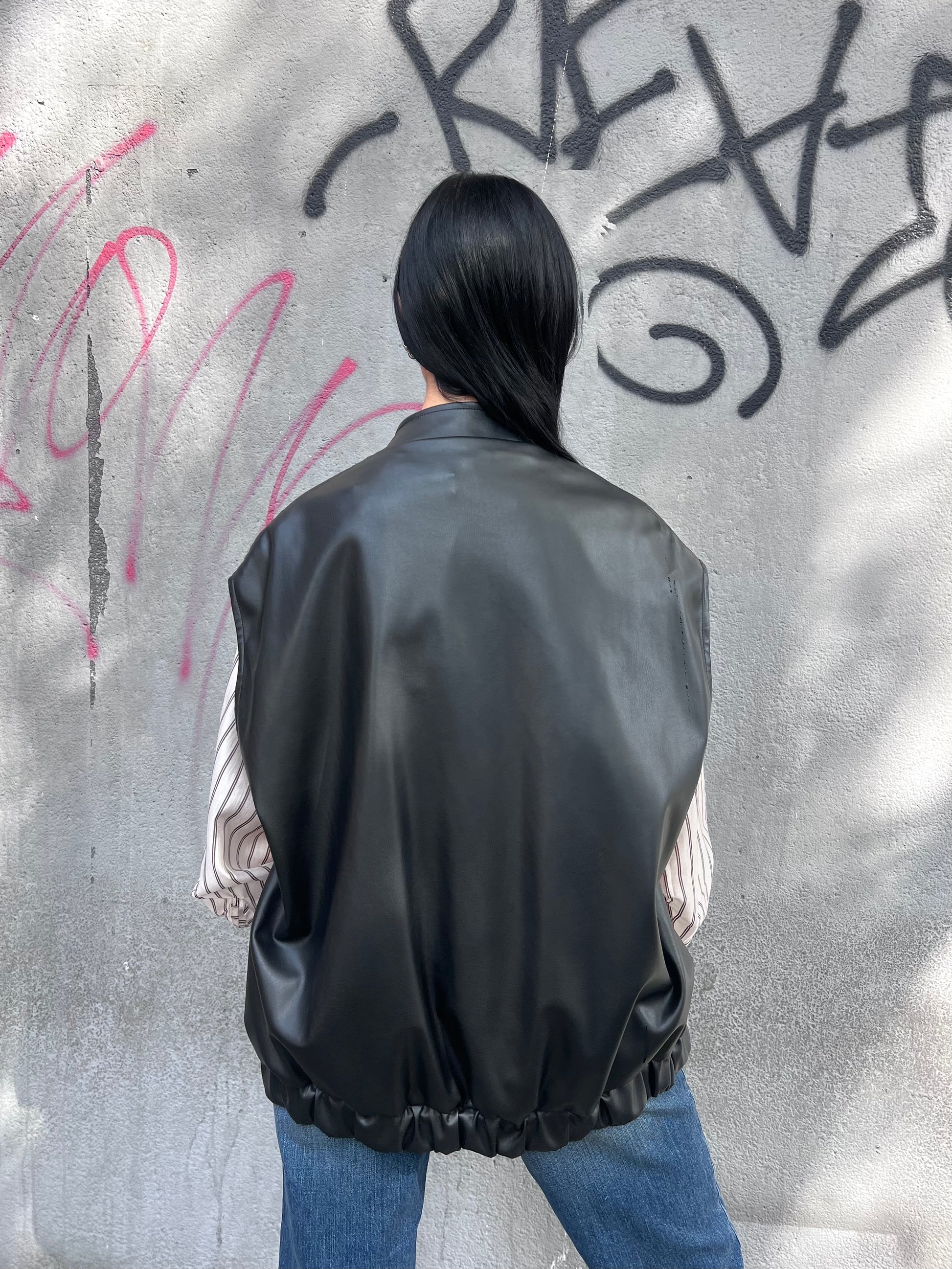 Bomber gilet ecopelle, modello over con chiusura bottoni. Tasche avanti. Elastico finale.