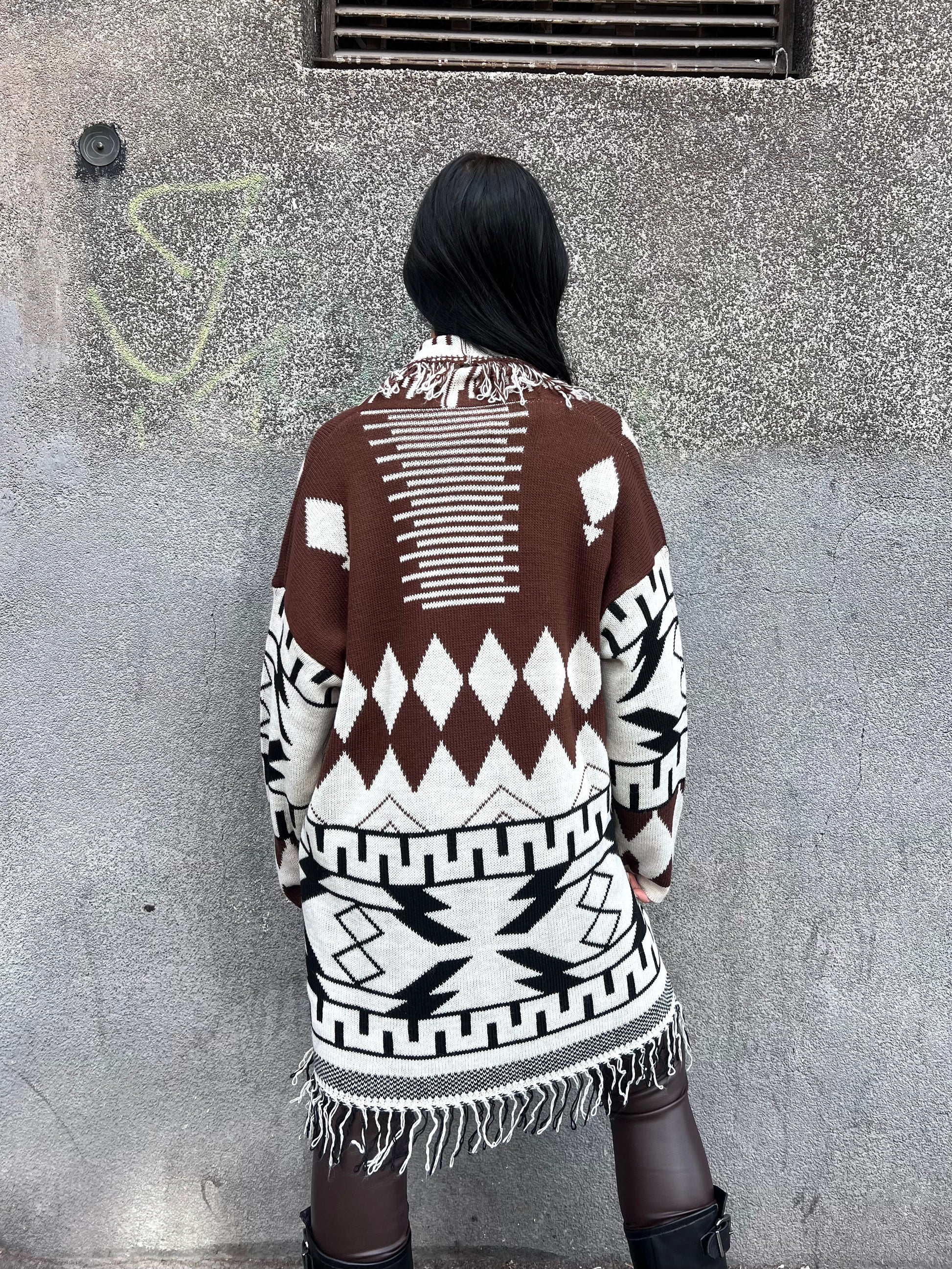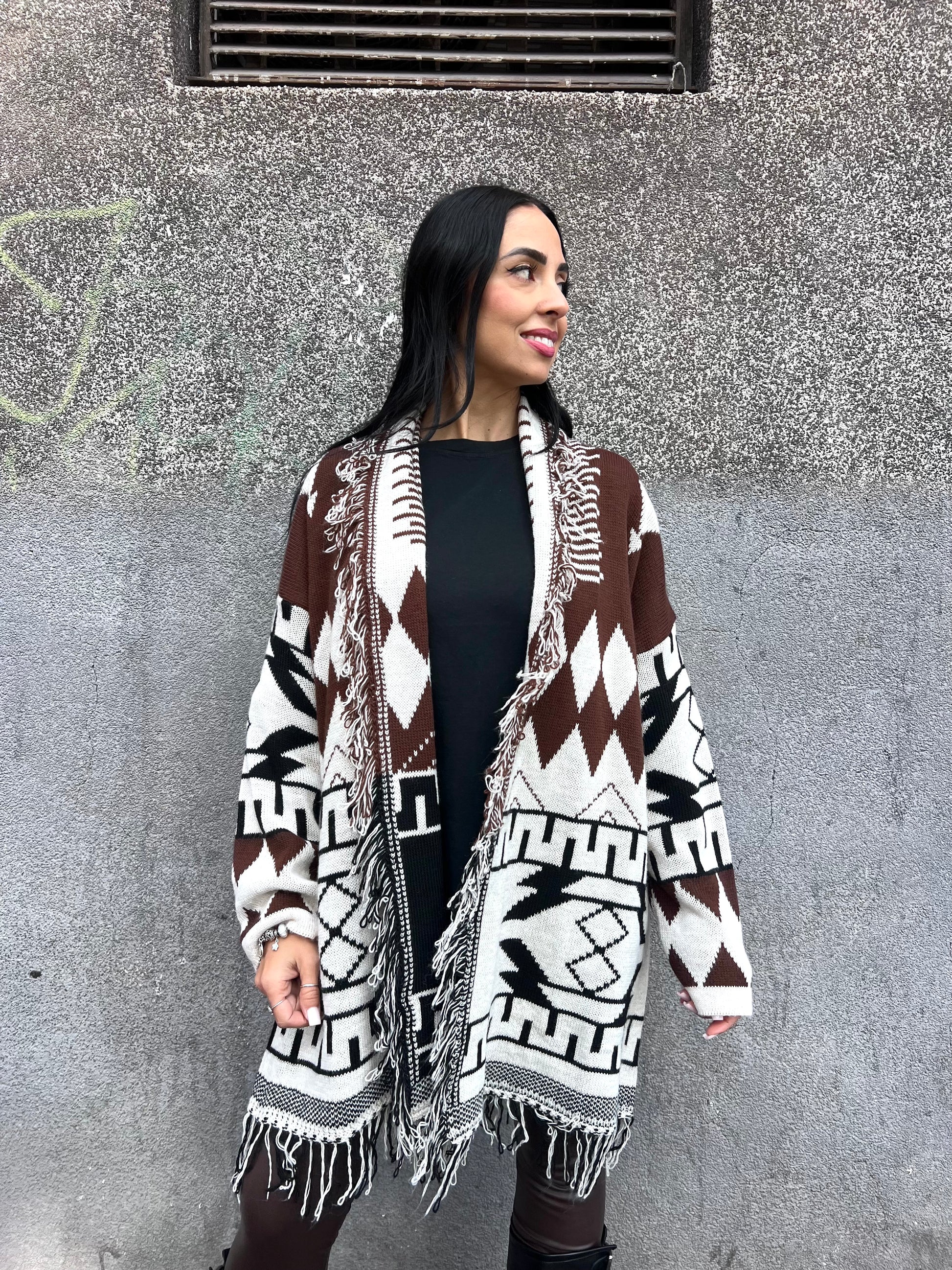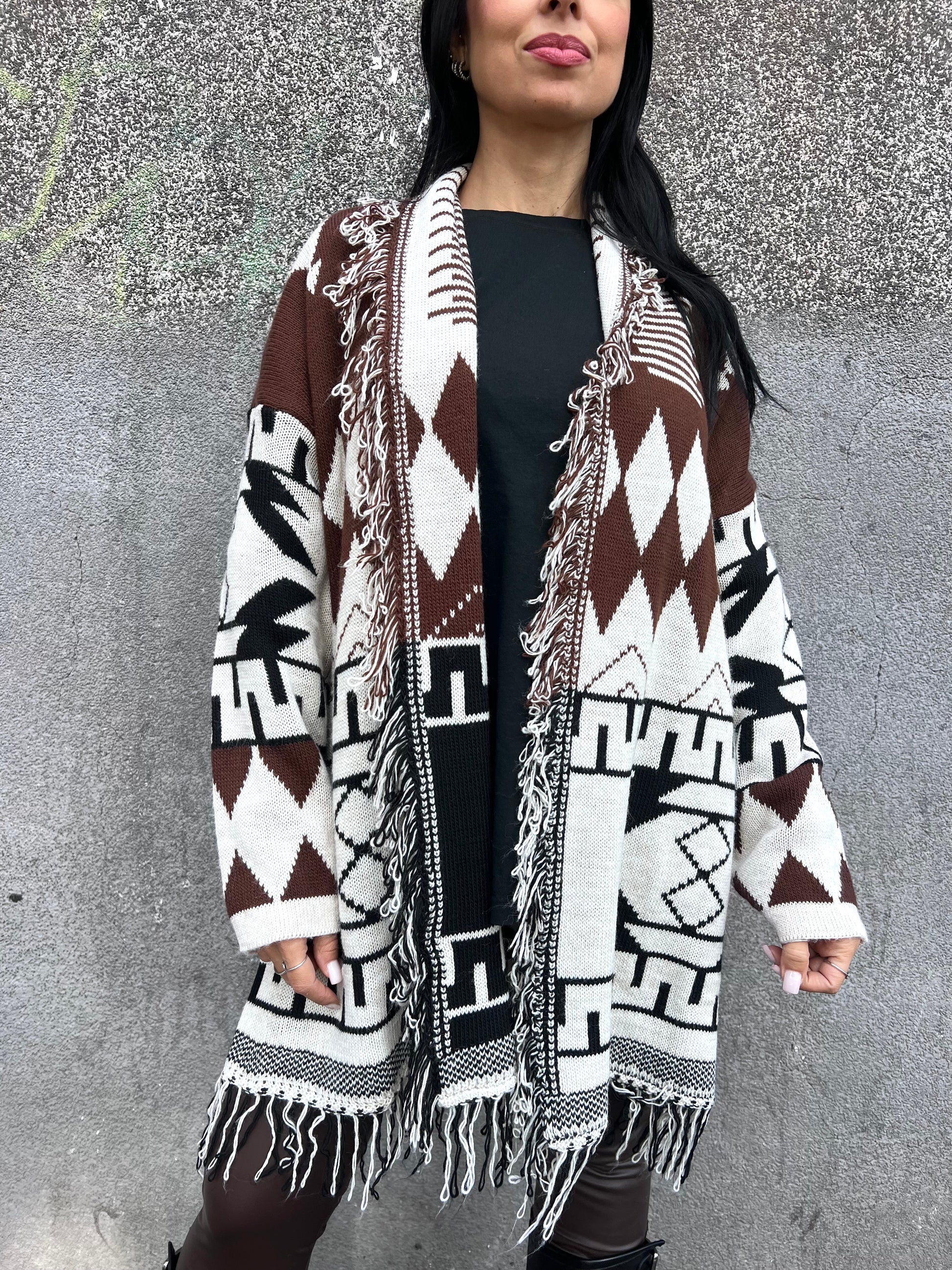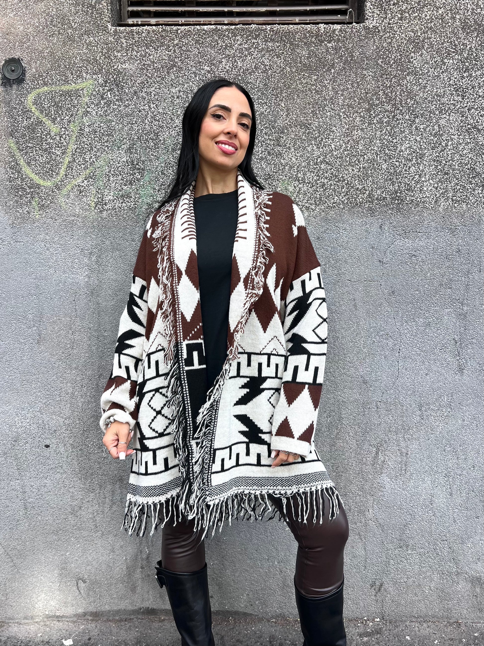 Cardigan caban fantasia etnico sfrangiato. Aperto senza cintura.