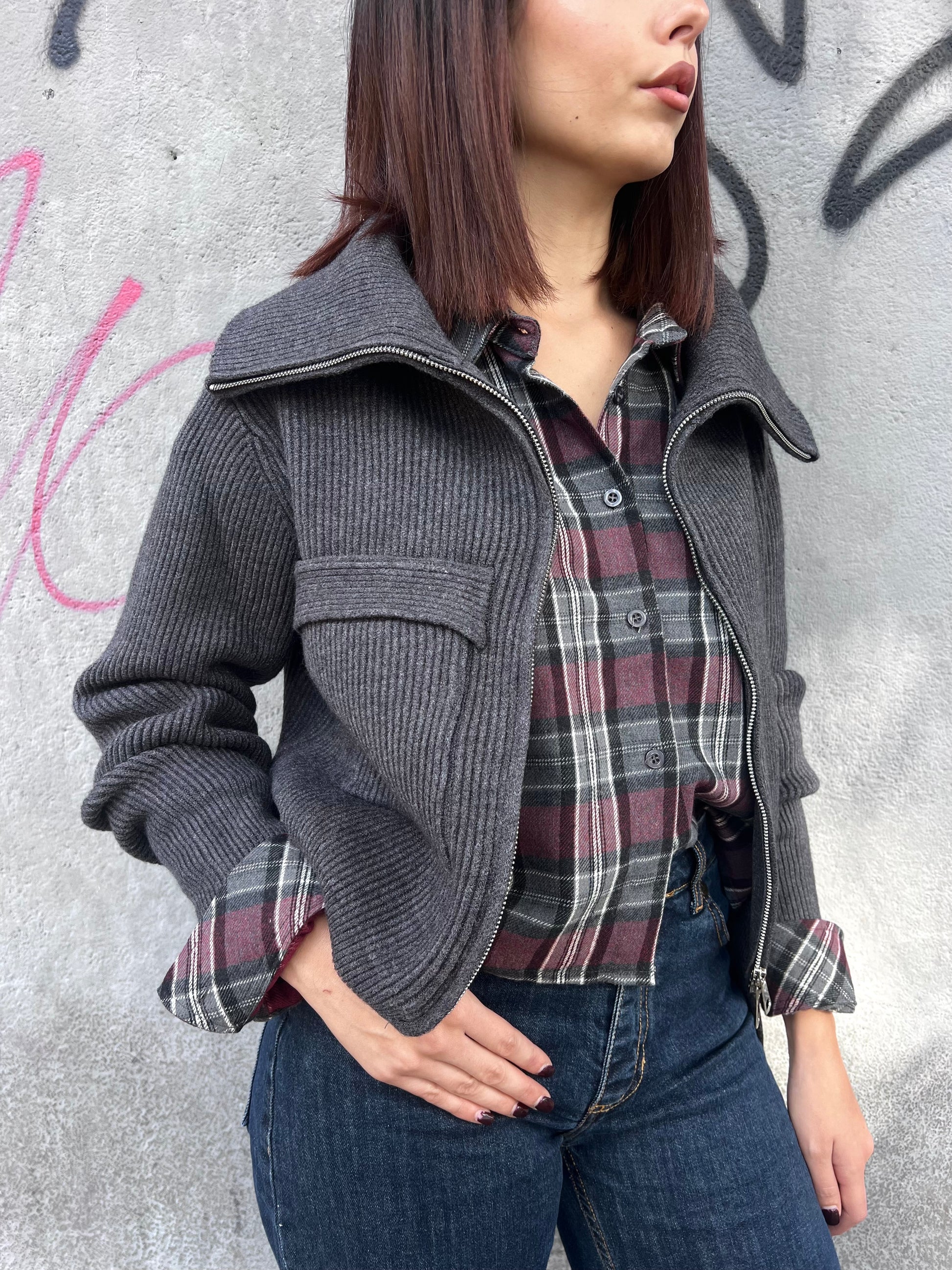 Cardigan coste, collo cratere chiusura cerniera. Taschina parte avanti.