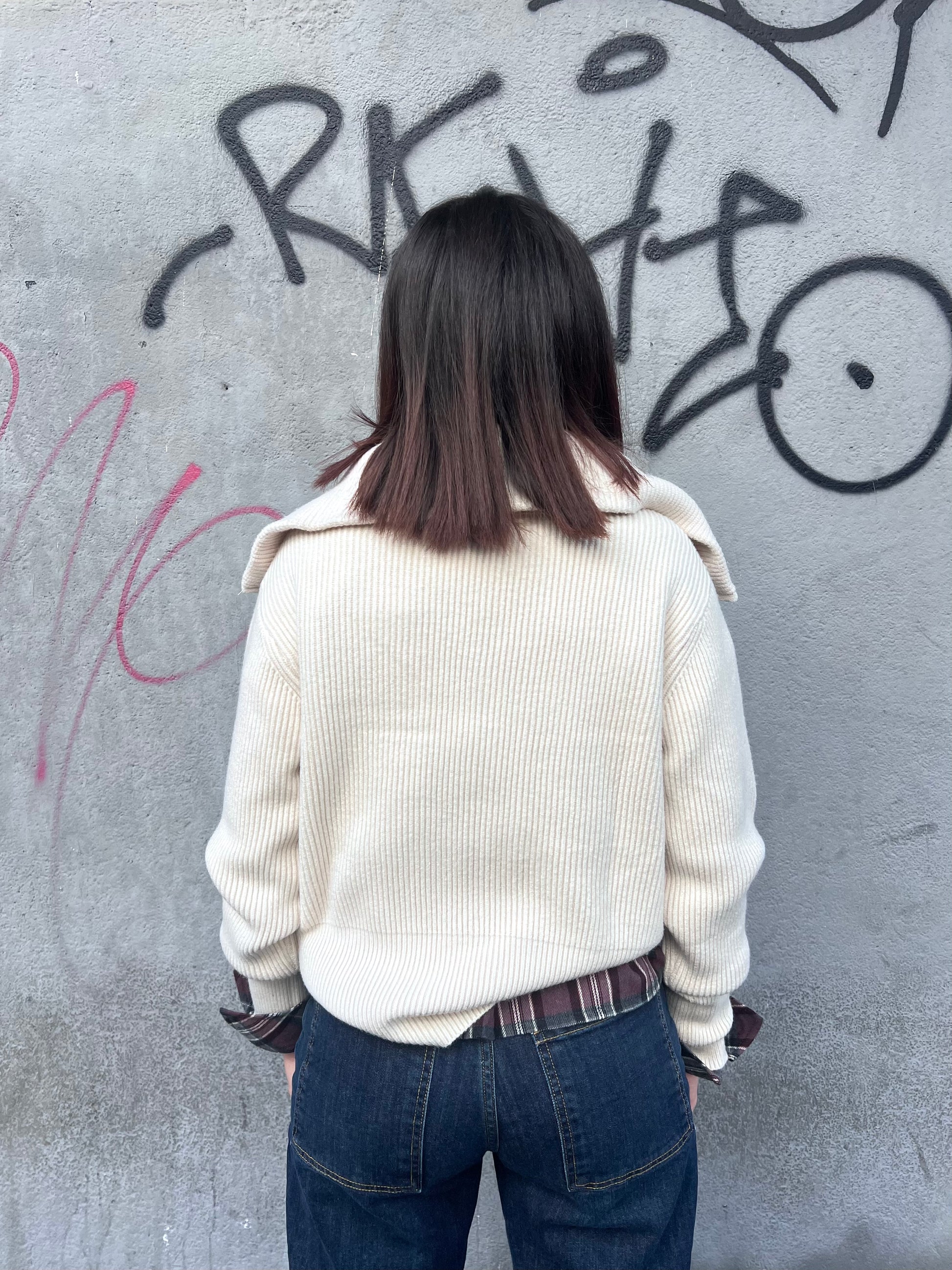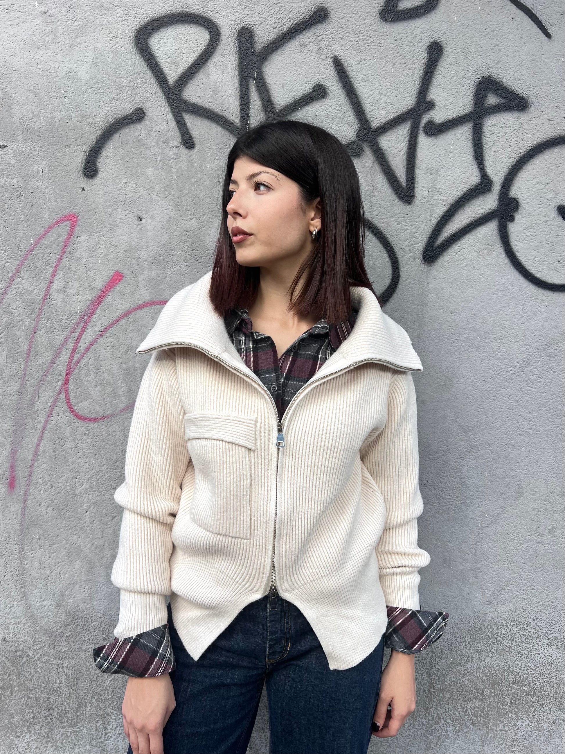 Cardigan coste, collo cratere chiusura cerniera. Taschina parte avanti.