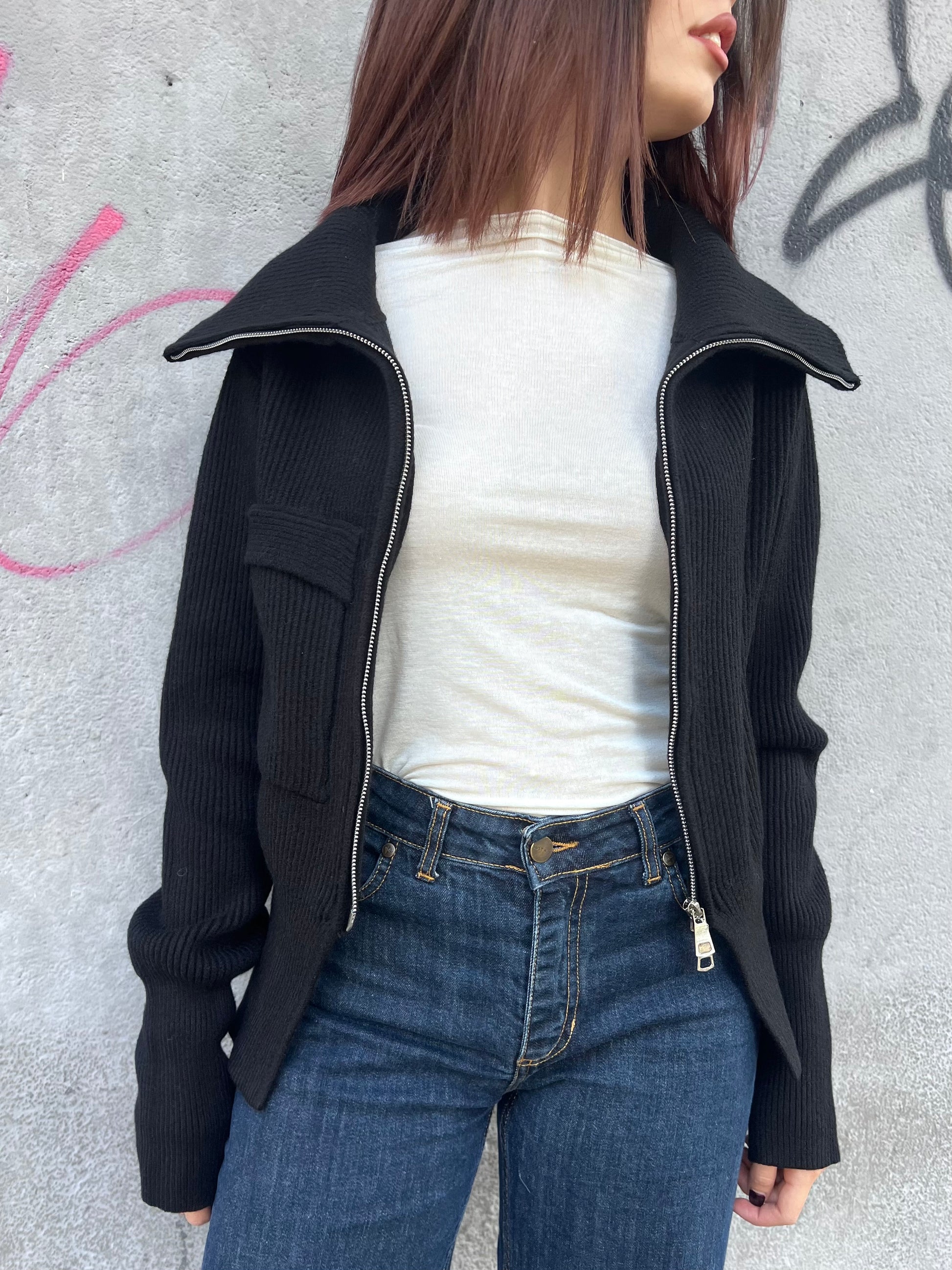 Cardigan coste, collo cratere chiusura cerniera. Taschina parte avanti.
