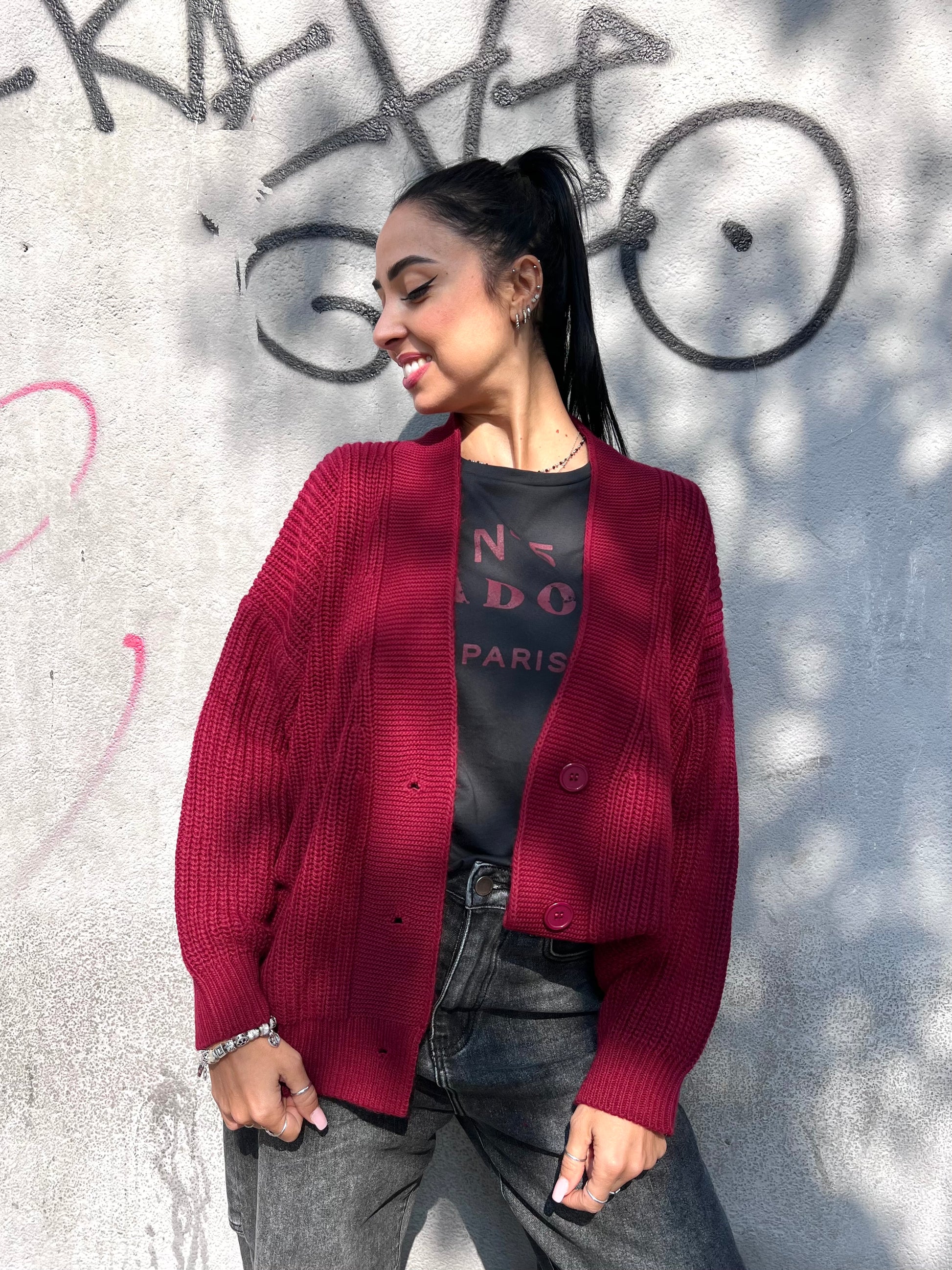 SUSY MIX CARDIGAN SCOLLO V BOTTONI YARI BURGUNDY