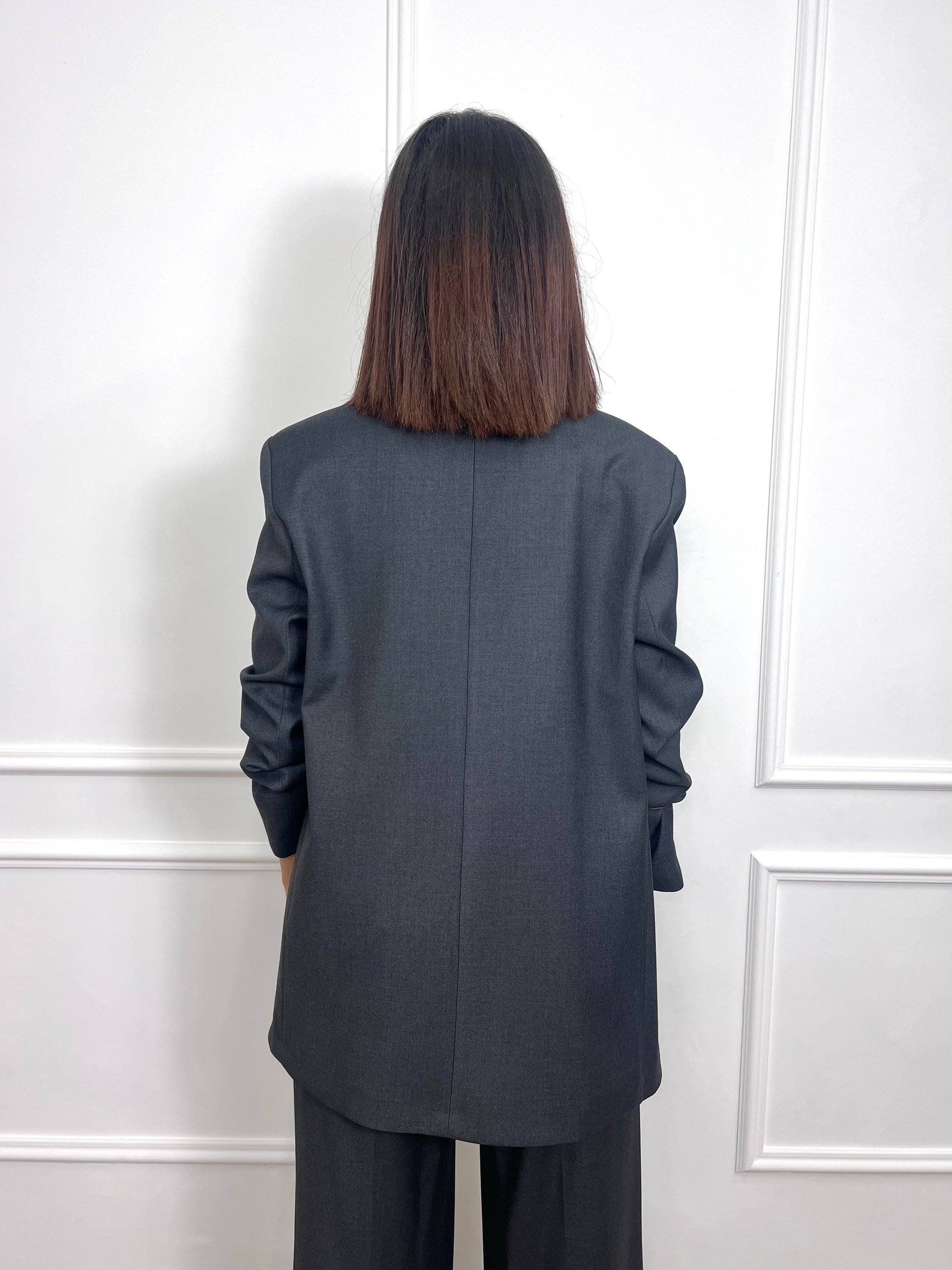 Giacca monopetto taglio sartoriale lunga. Collo Rever chiusura due bottoni. Foderata. Spalline.