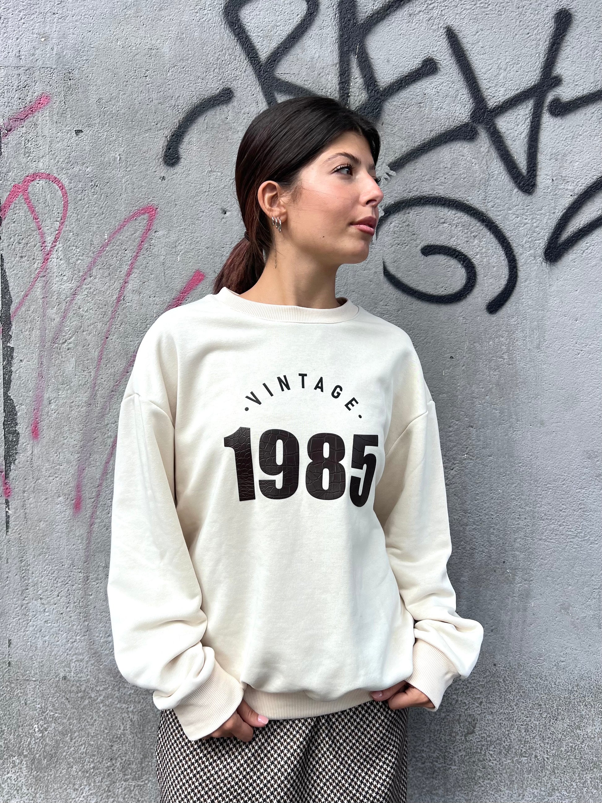 Felpa over girocollo stampa “ VINTAGE 1985 “ in ecopelle cocco. Tessuto felpa cotone garzato.