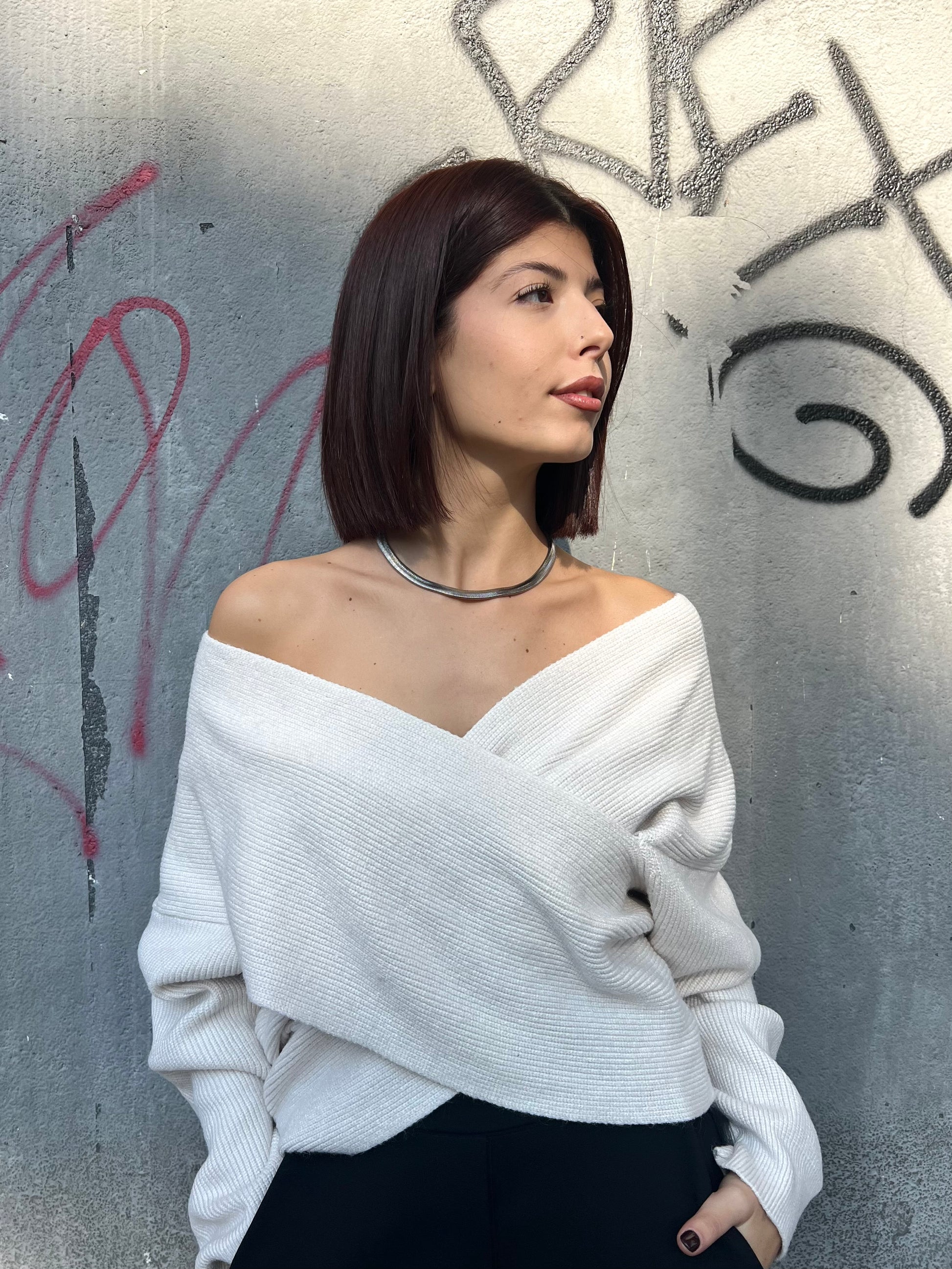 Maglia incrocio a coste. Modello morbido da portare anche con scollatura scesa sulle spalle.