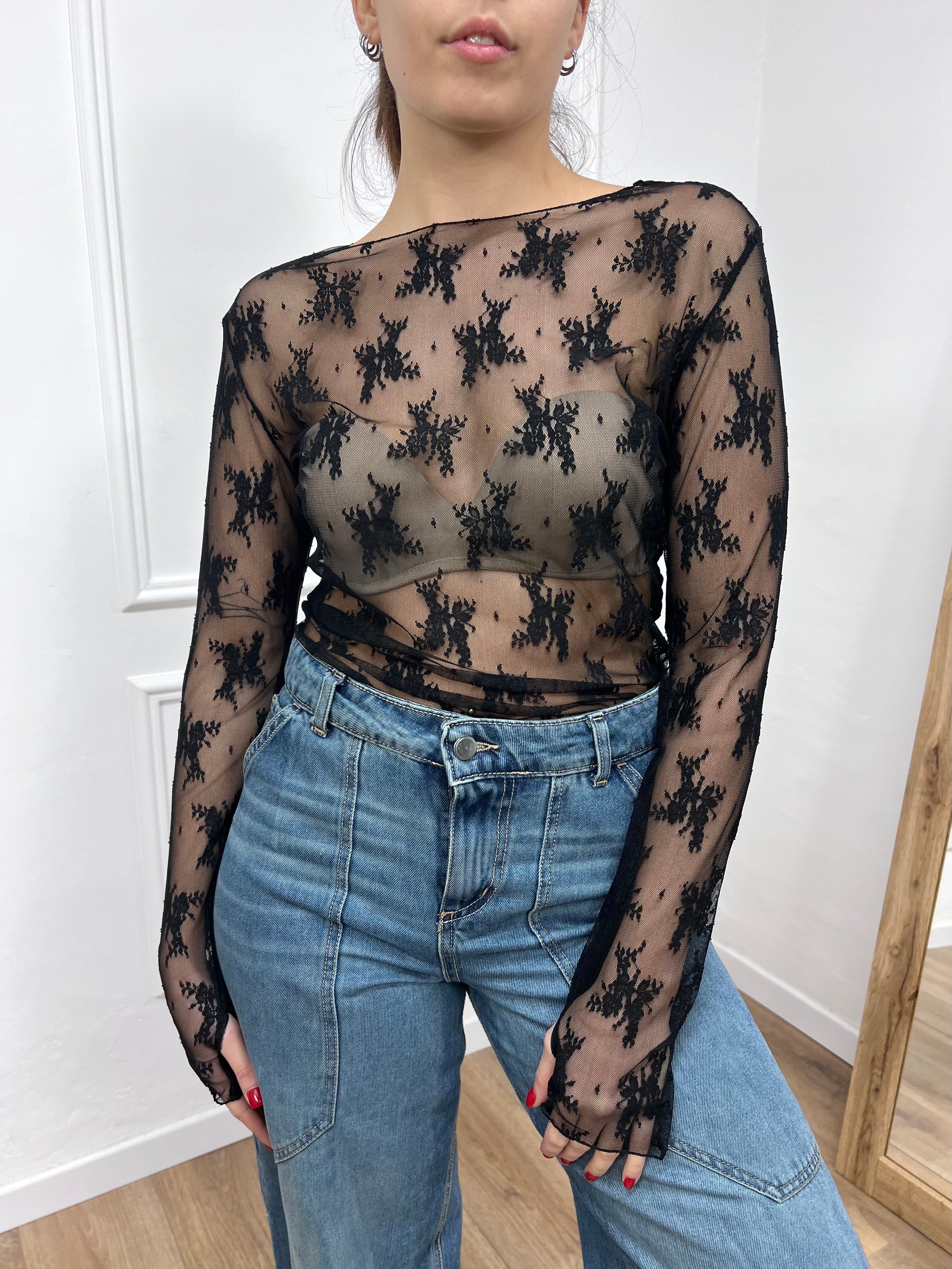 Maglia in pizzo girocollo con manicotti. Modello accostato perfetta da mettere come sottogiacca.