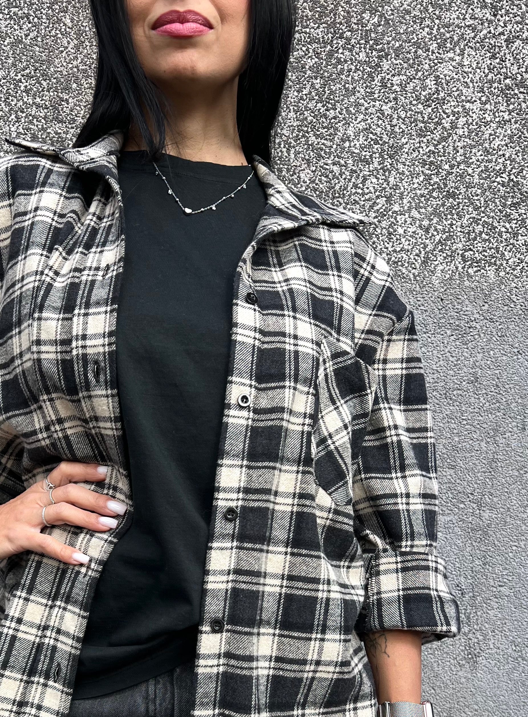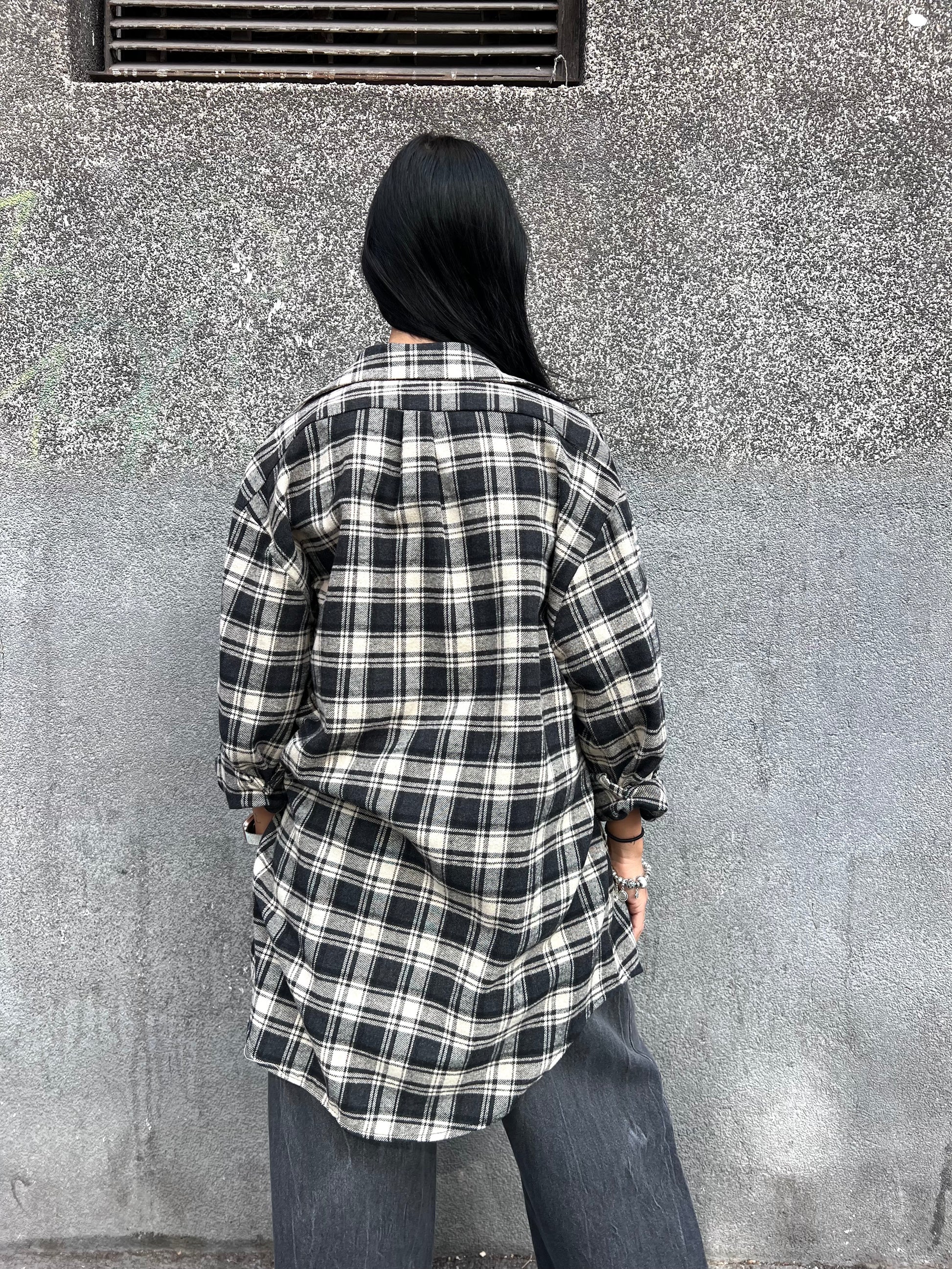Maxi camicia check in flanella. Modello over lungo. Abbottonatura sul davanti. Tasca su seno.
