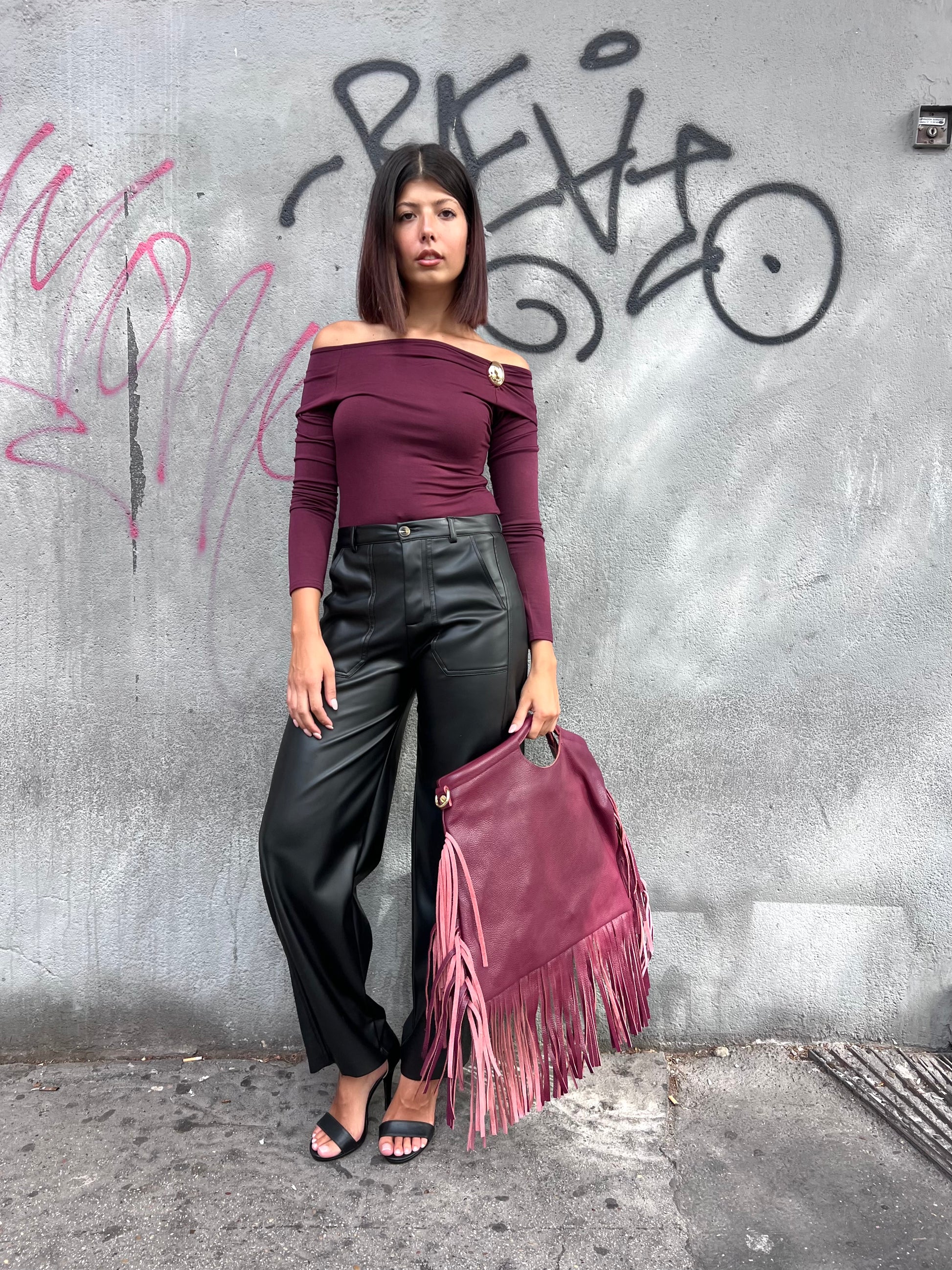 Pantalone vita alta ecopelle. Modello ballon. Chiusura cerniera, bottone e passanti. Molla retro vita.